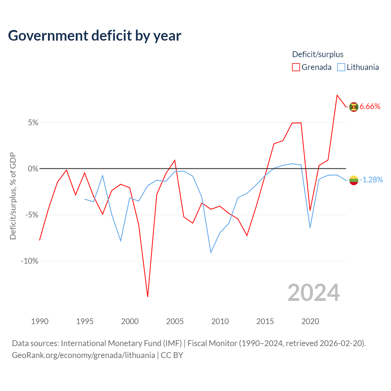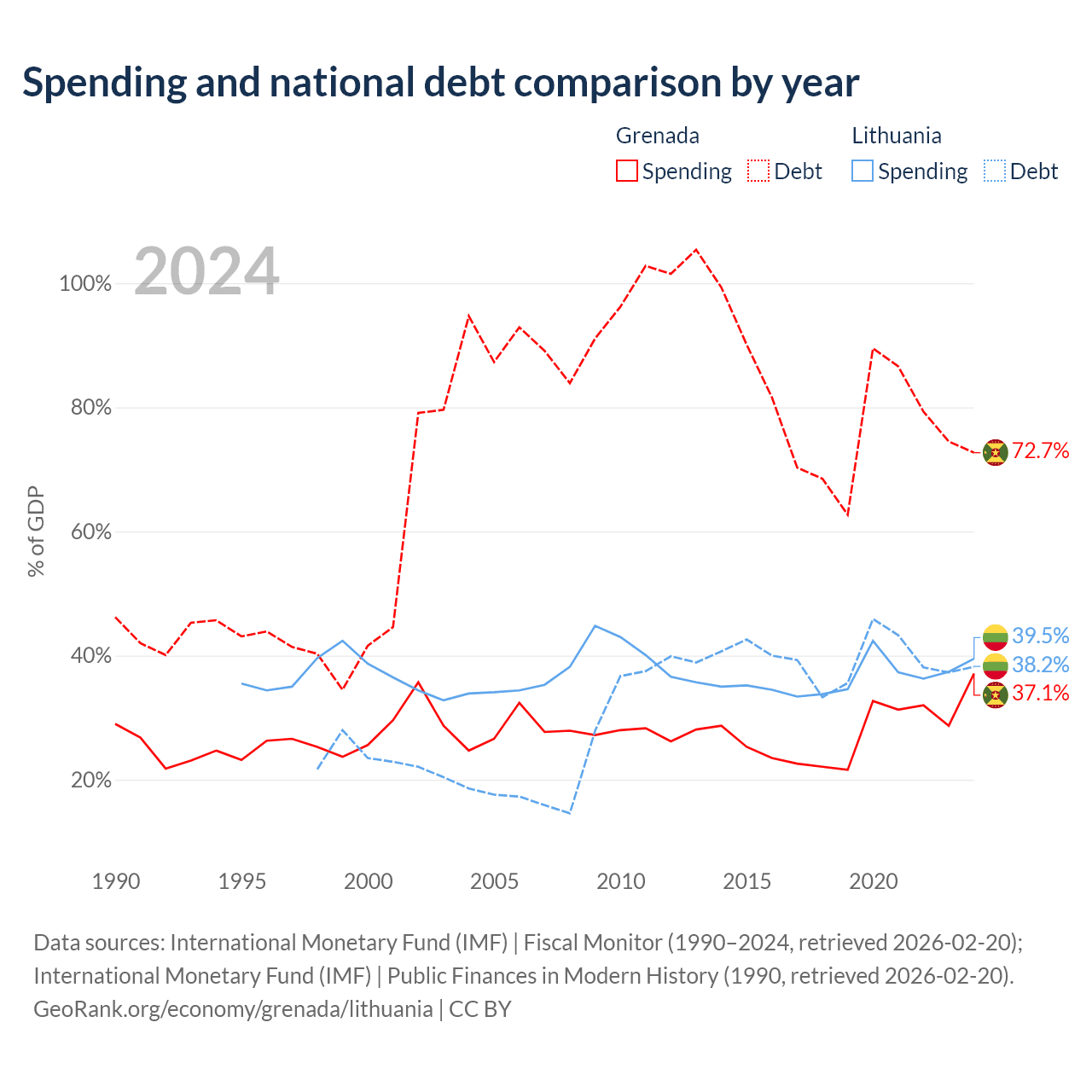Grenada has $997M in government debt (72.7% of GDP), compared to $32.4B (38.2% of GDP) in Lithuania.