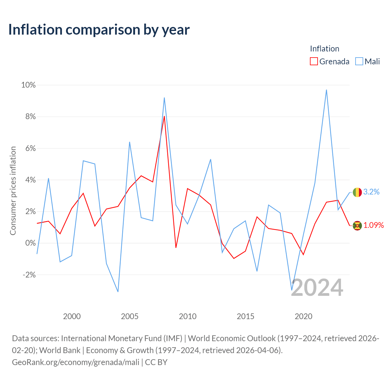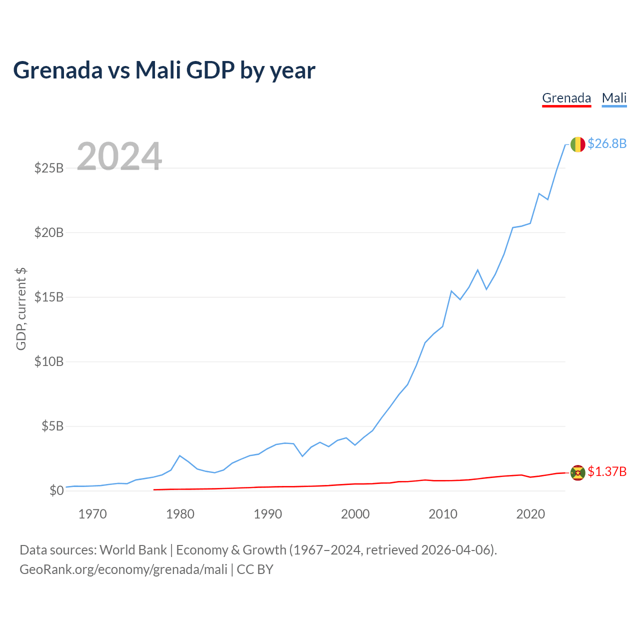 Grenada has a GDP of $1.37B compared to $26.8B for Mali, ranking 184/197 and 113/197 by economy size, respectively.