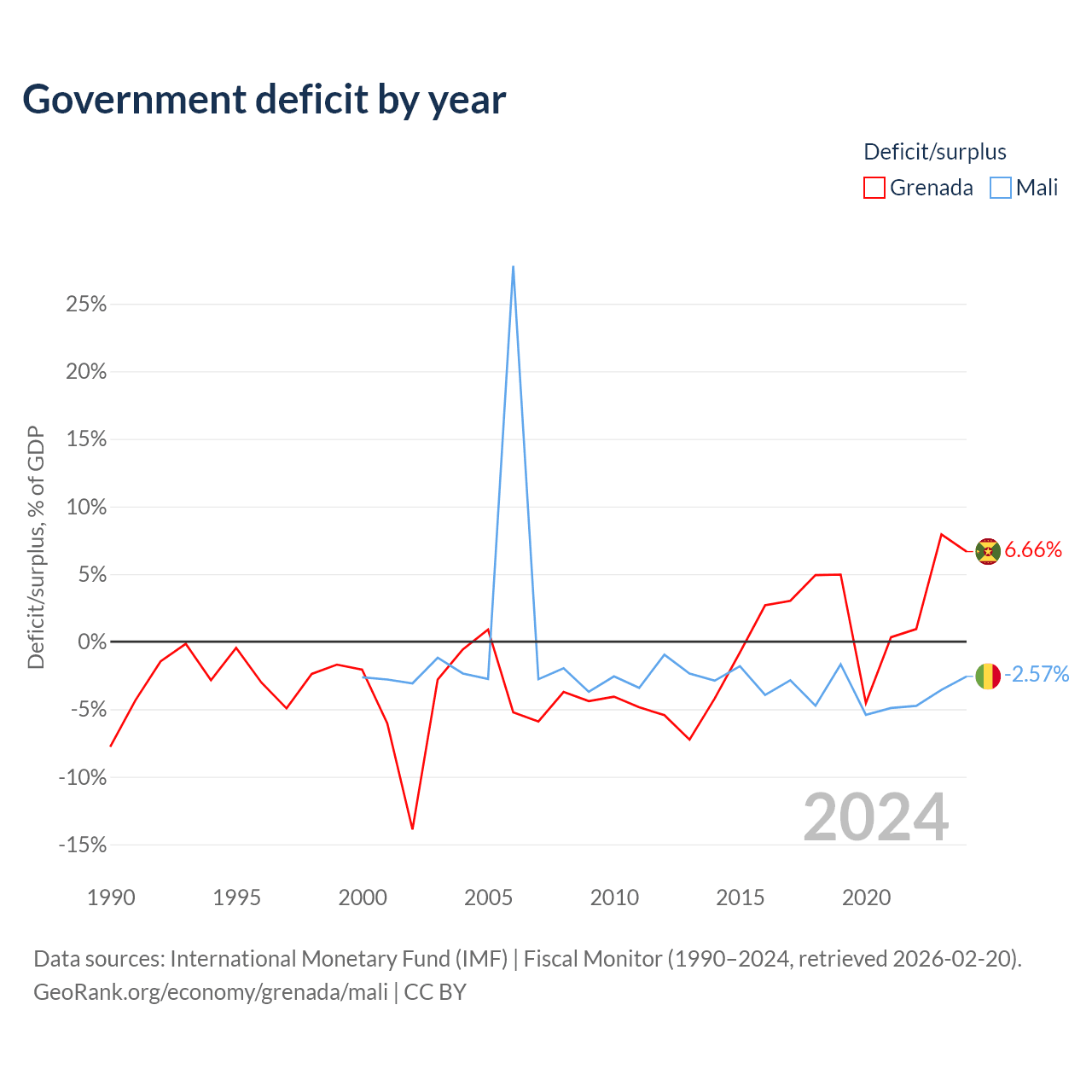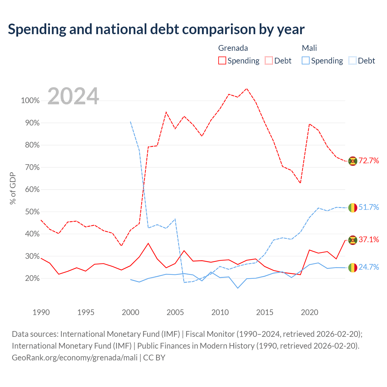 Grenada has $997M in government debt (72.7% of GDP), compared to $13.9B (51.7% of GDP) in Mali.