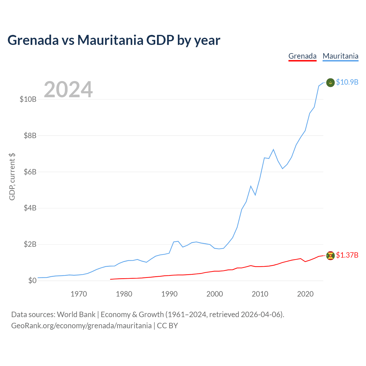 Grenada has a GDP of $1.37B compared to $10.9B for Mauritania, ranking 184/197 and 153/197 by economy size, respectively.
