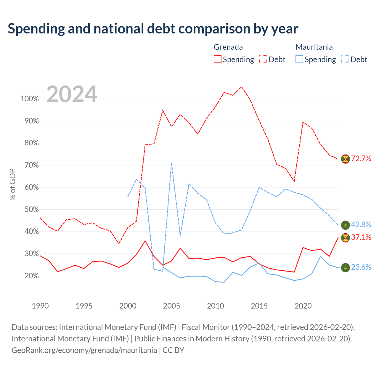 Grenada has $997M in government debt (72.7% of GDP), compared to $4.67B (42.8% of GDP) in Mauritania.