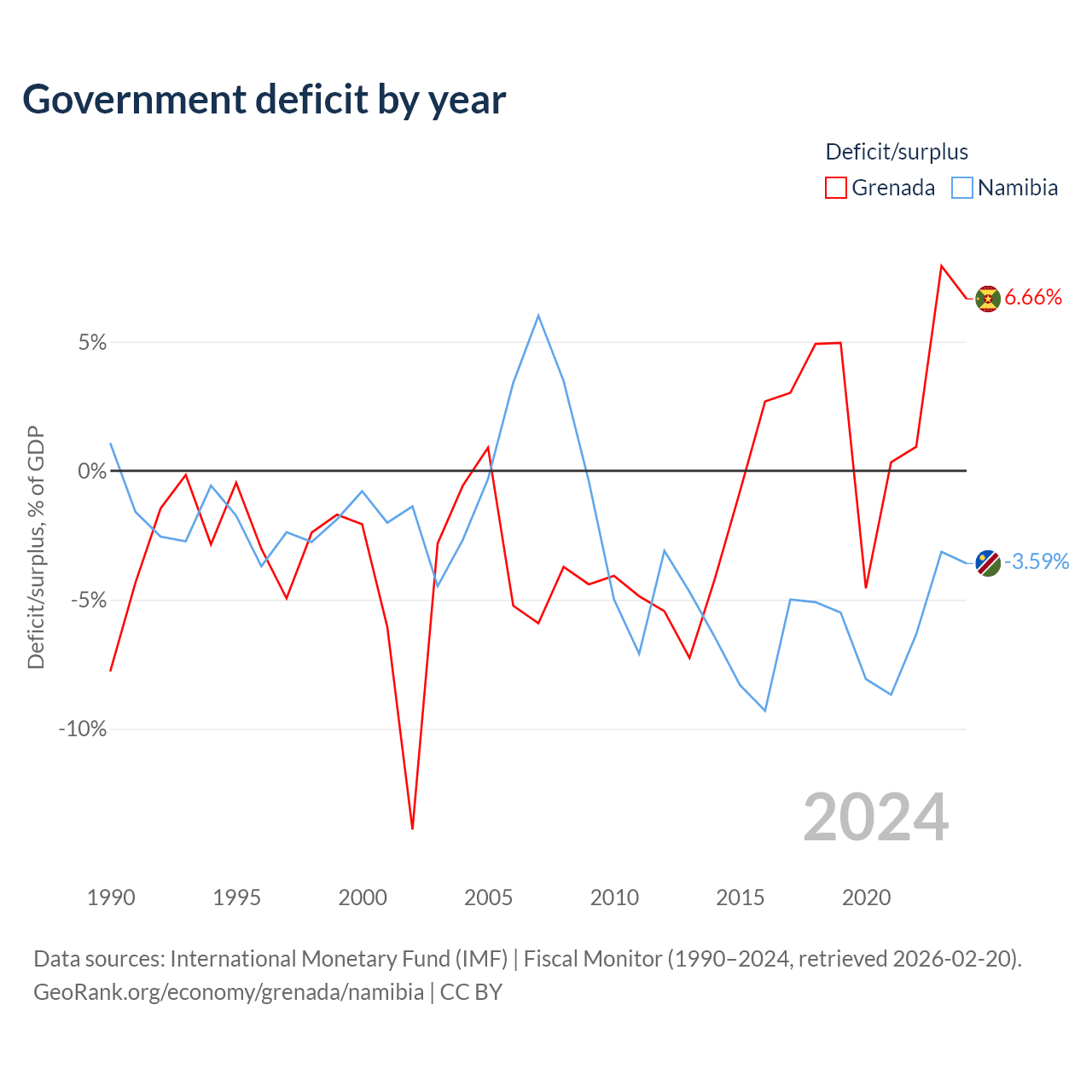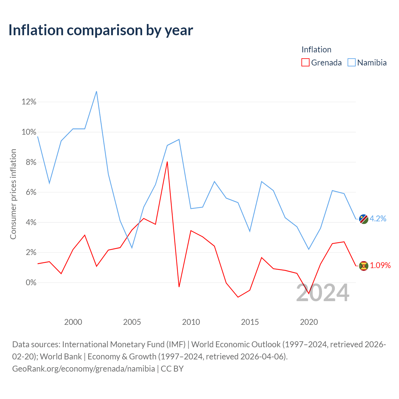 Grenada has a GDP of $1.37B compared to $13.4B for Namibia, ranking 184/197 and 147/197 by economy size, respectively.