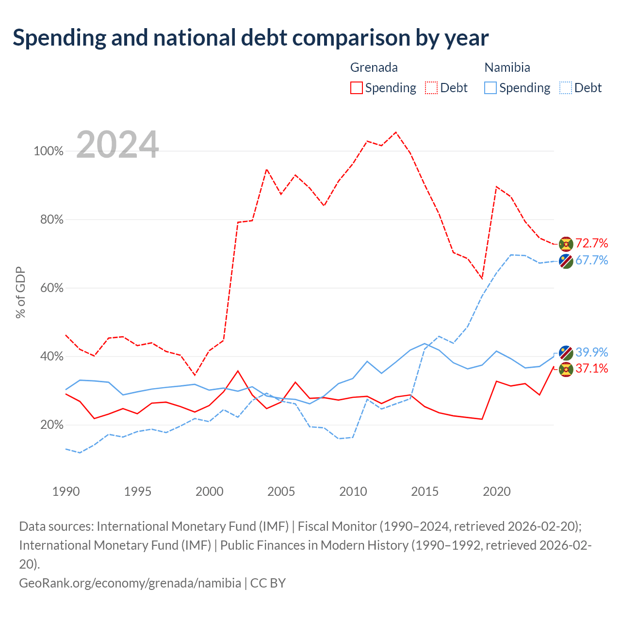 Grenada has $997M in government debt (72.7% of GDP), compared to $9.05B (67.7% of GDP) in Namibia.