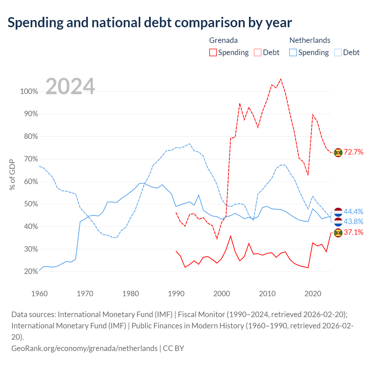 Grenada has $997M in government debt (72.7% of GDP), compared to $532B (43.8% of GDP) in the Netherlands.