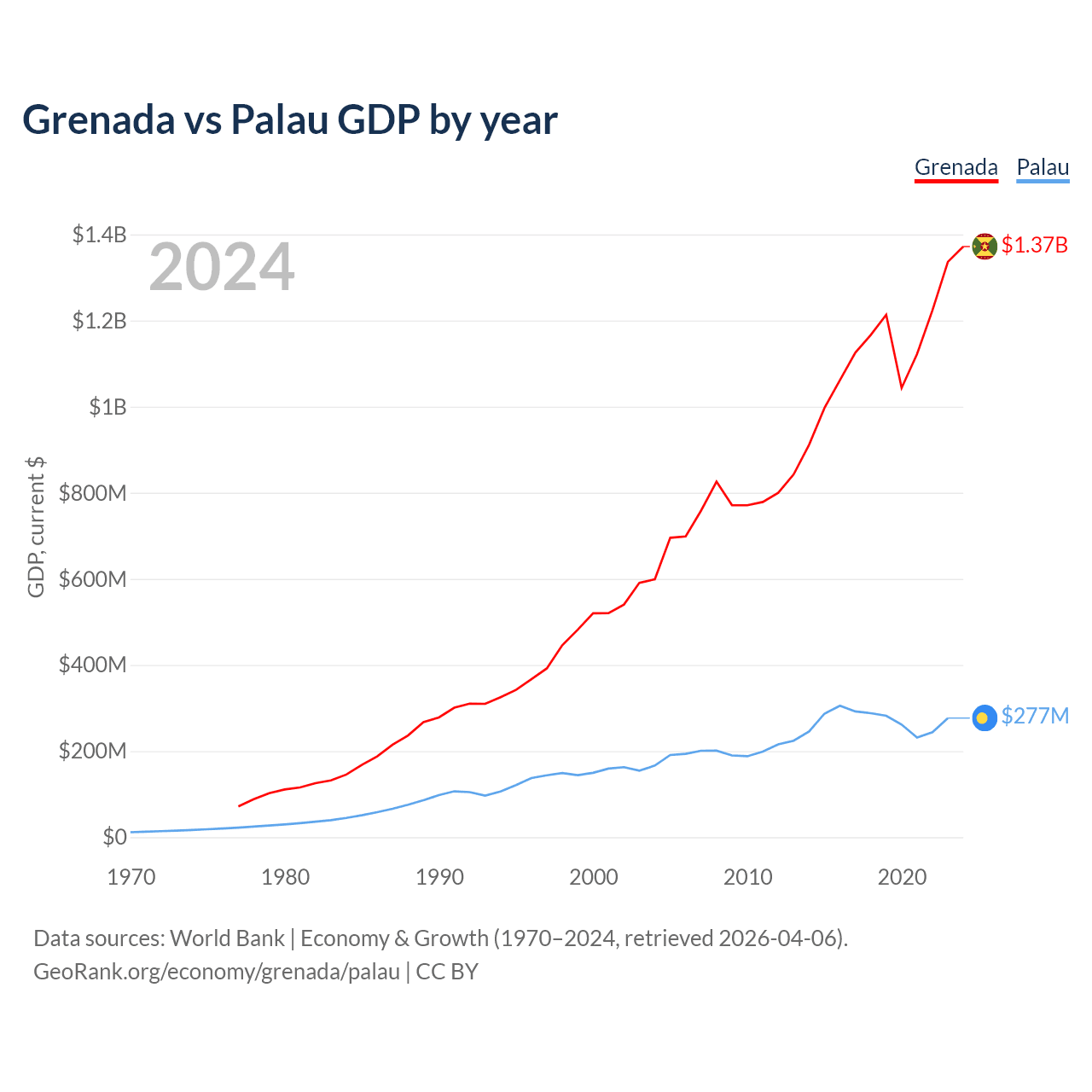 Grenada has a GDP of $1.37B compared to $277M for Palau, ranking 184/197 and 194/197 by economy size, respectively.