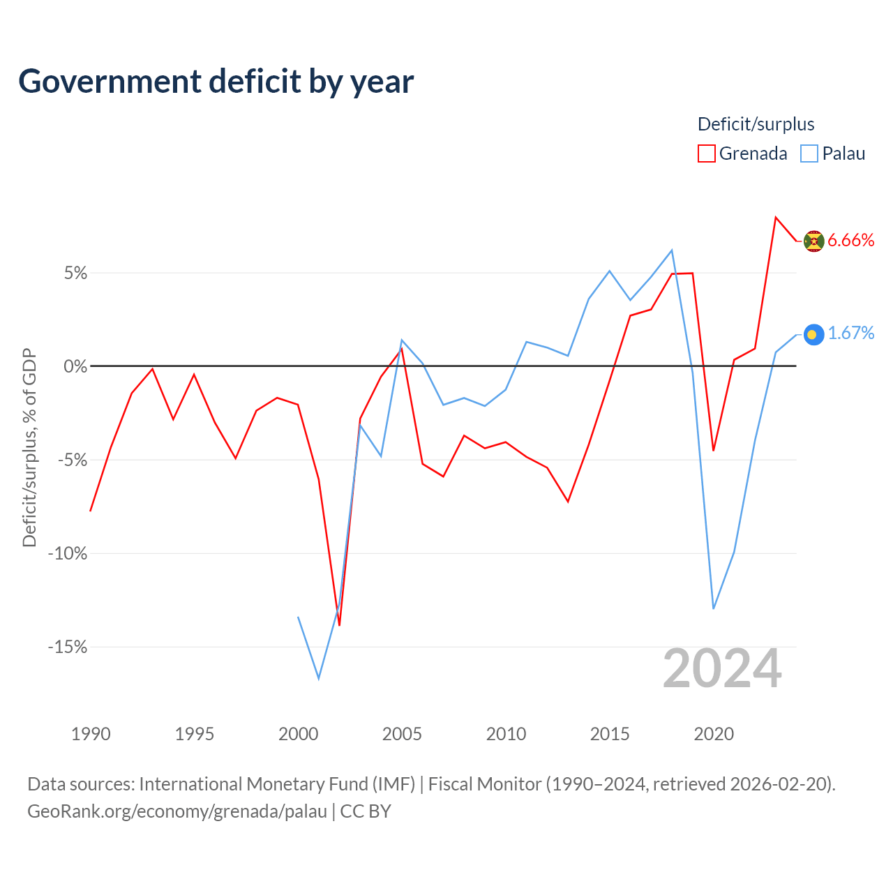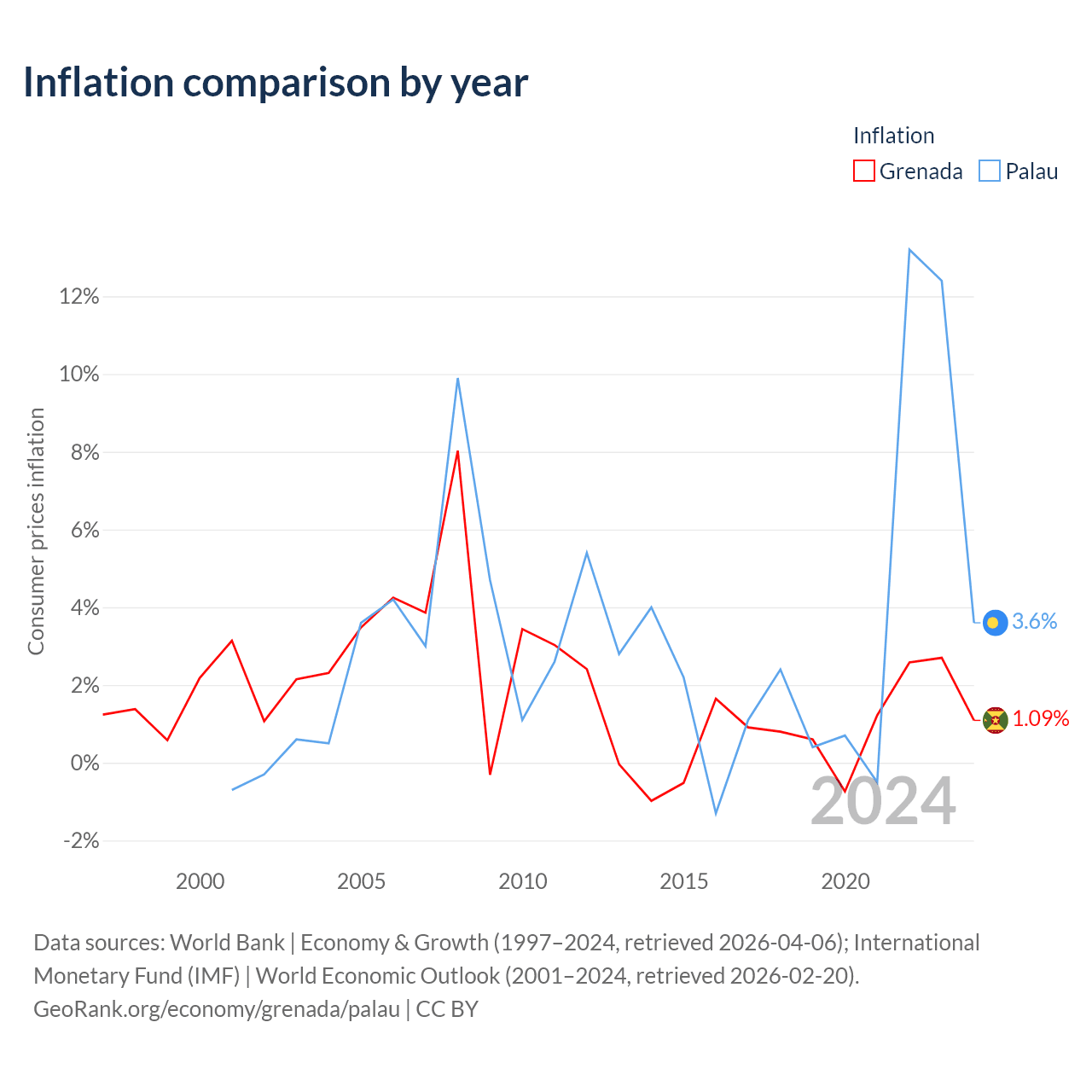 Over the past 24 years, Grenada has recorded an average annual inflation rate of 1.92%, compared with 3.15% in Palau. In 2024, inflation was 1.09% in Grenada and 3.6% in Palau.