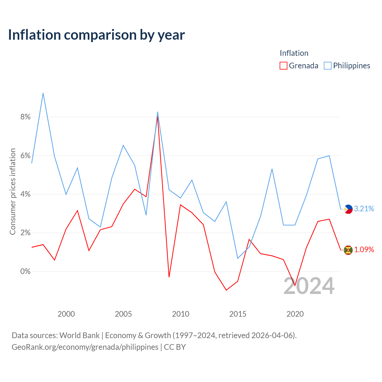 Grenada has a GDP of $1.37B compared to $462B for the Philippines, ranking 184/197 and 35/197 by economy size, respectively.