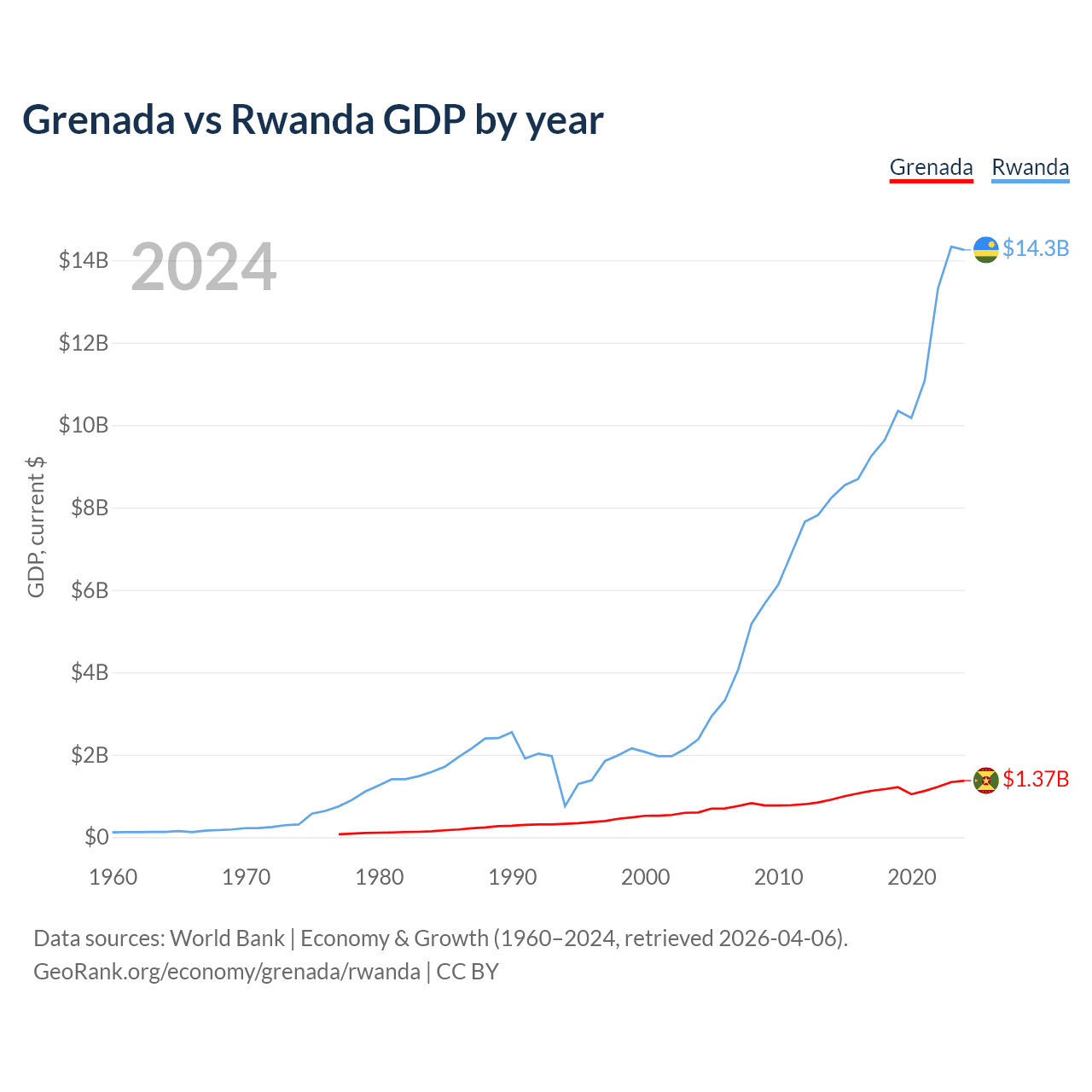Grenada has a GDP of $1.37B compared to $14.3B for Rwanda, ranking 184/197 and 144/197 by economy size, respectively.