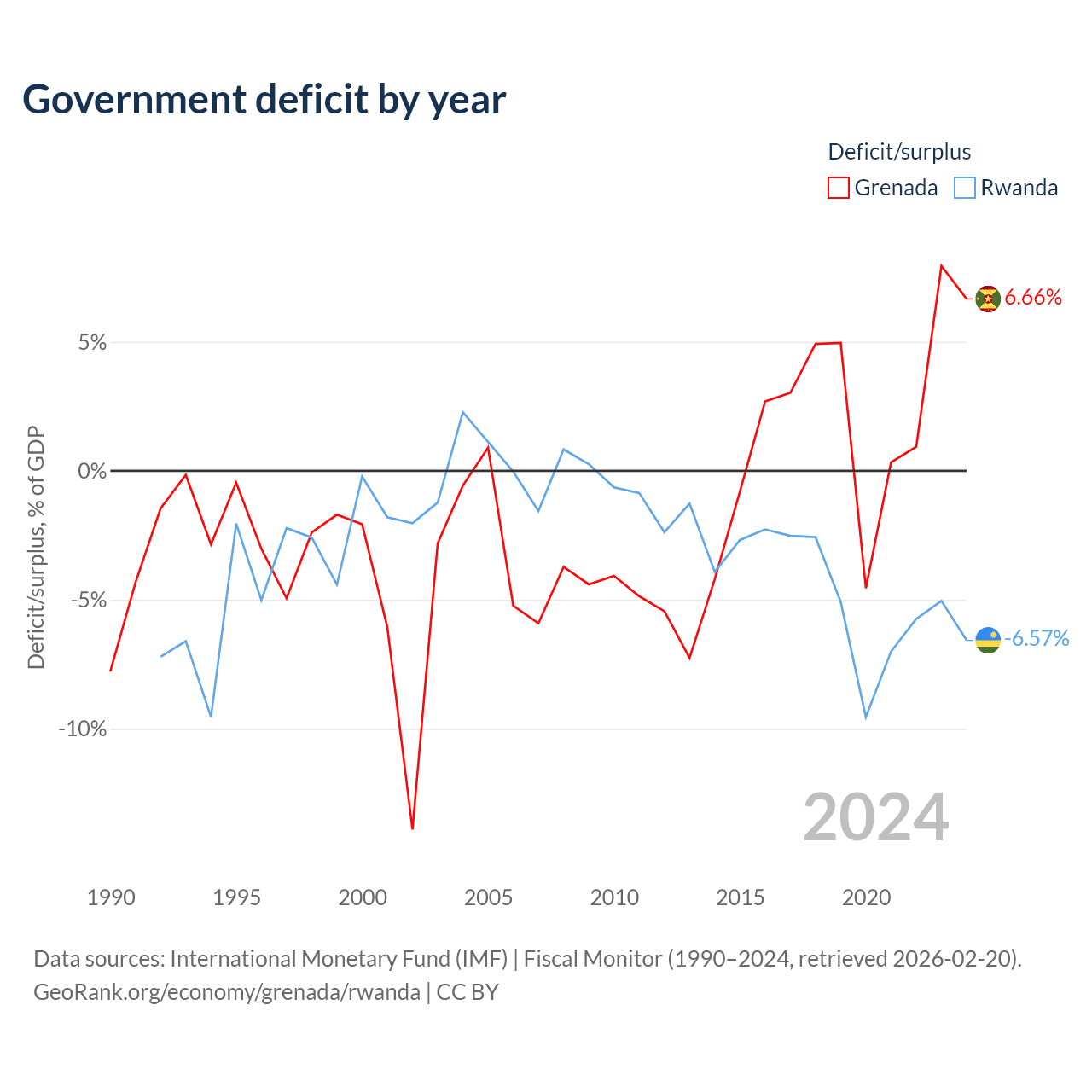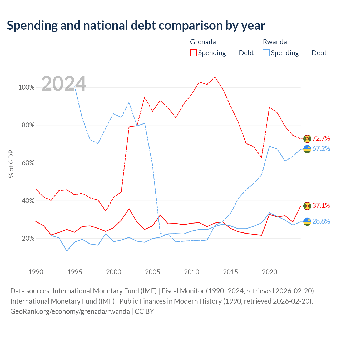 Grenada has $997M in government debt (72.7% of GDP), compared to $9.58B (67.2% of GDP) in Rwanda.