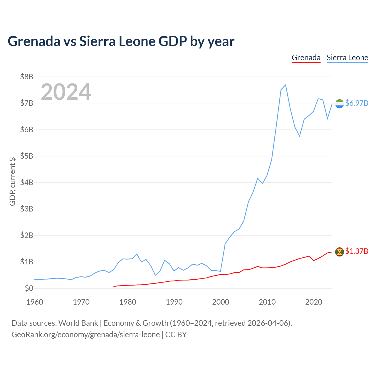 Grenada has a GDP of $1.37B compared to $6.97B for Sierra Leone, ranking 184/197 and 160/197 by economy size, respectively.