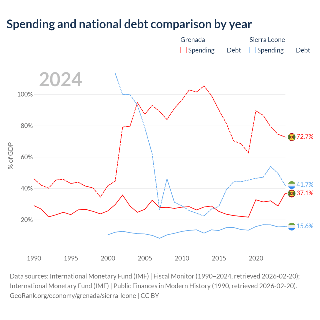 Grenada has $997M in government debt (72.7% of GDP), compared to $2.91B (41.7% of GDP) in Sierra Leone.