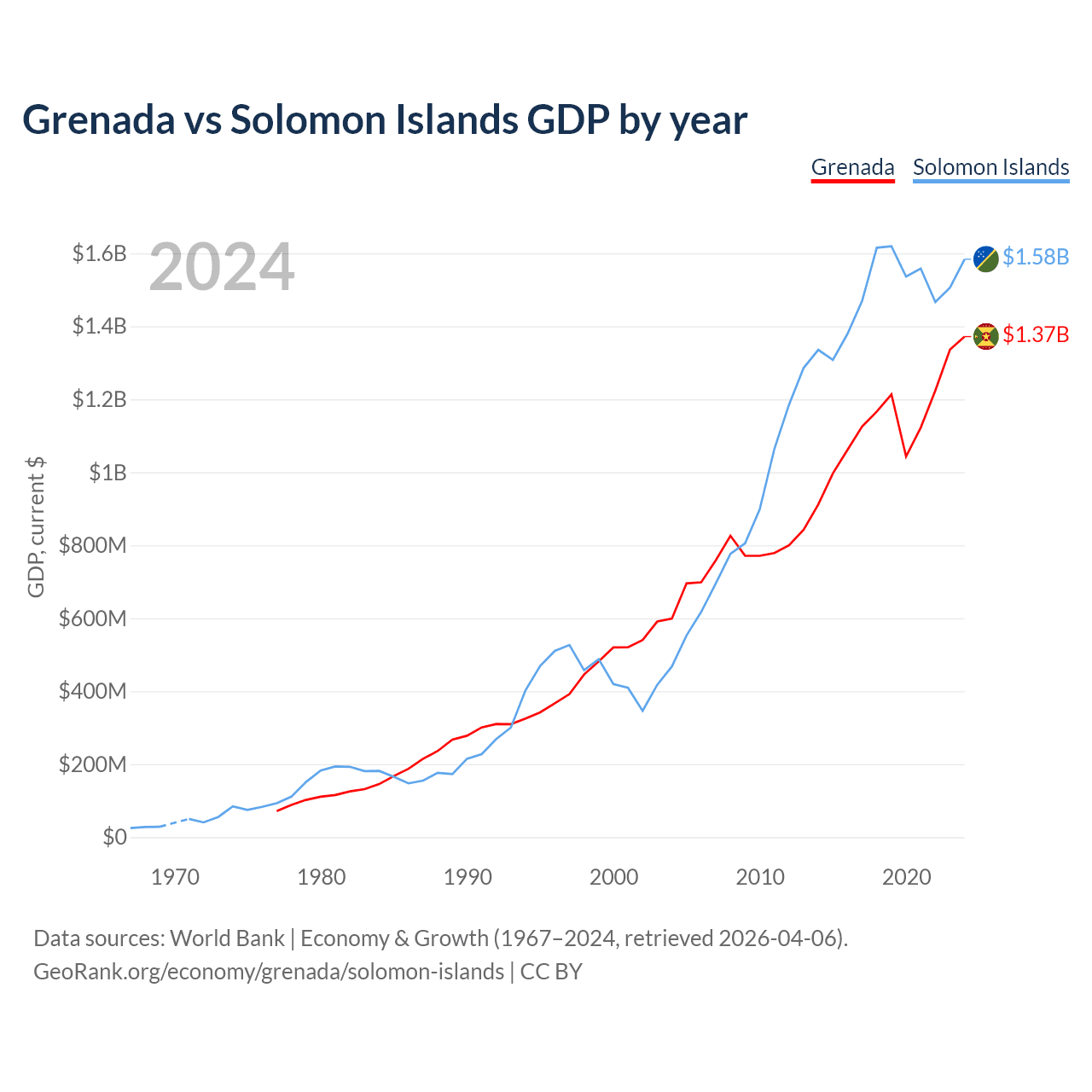 Grenada has a GDP of $1.37B compared to $1.58B for the Solomon Islands, ranking 184/197 and 182/197 by economy size, respectively.