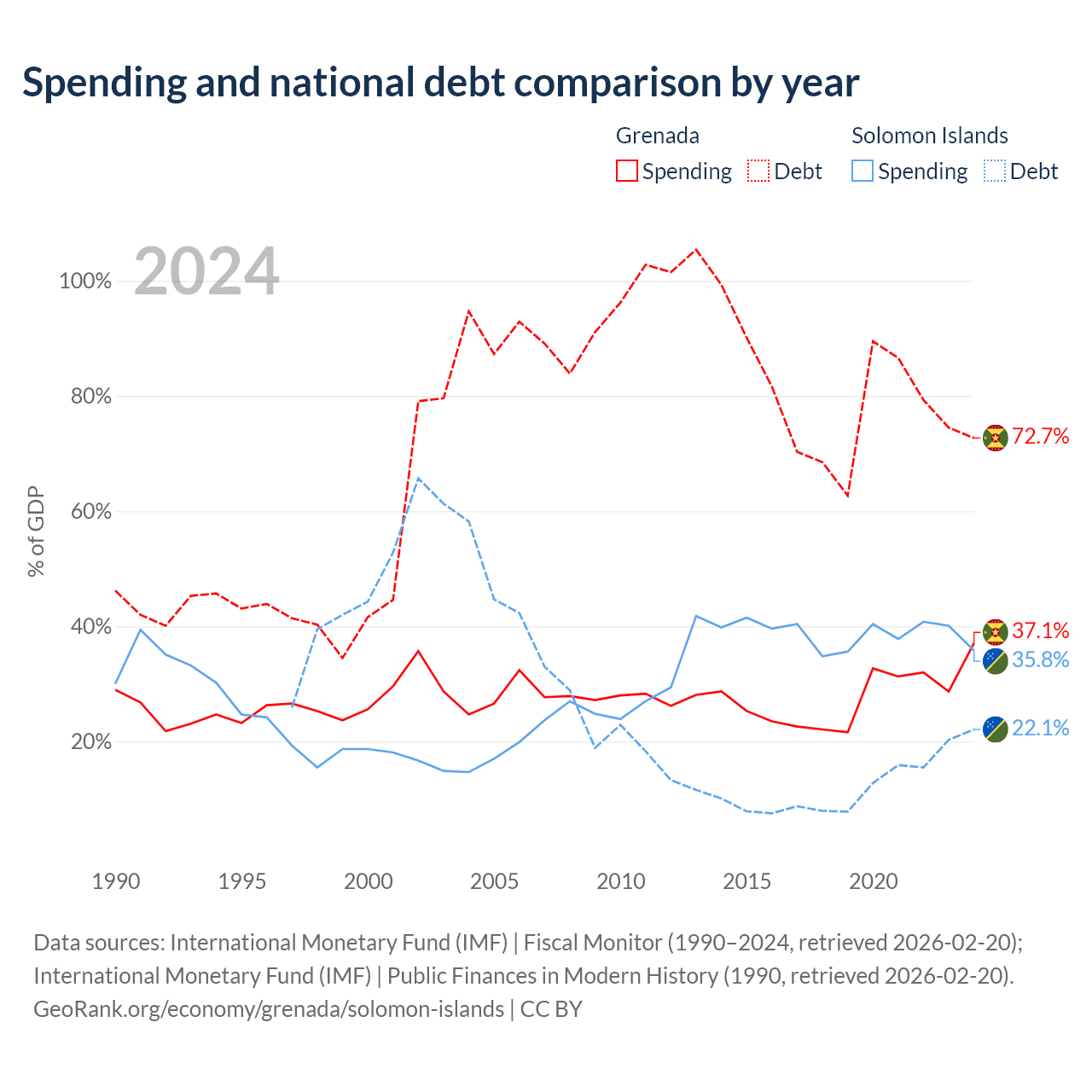 Grenada has $997M in government debt (72.7% of GDP), compared to $350M (22.1% of GDP) in the Solomon Islands.