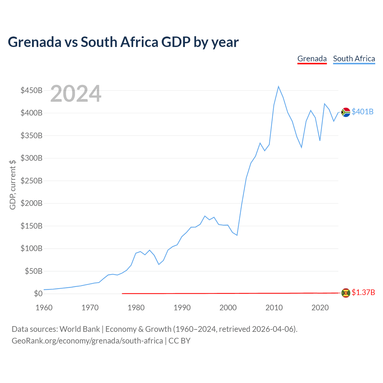 Grenada has a GDP of $1.37B compared to $401B for South Africa, ranking 184/197 and 40/197 by economy size, respectively.