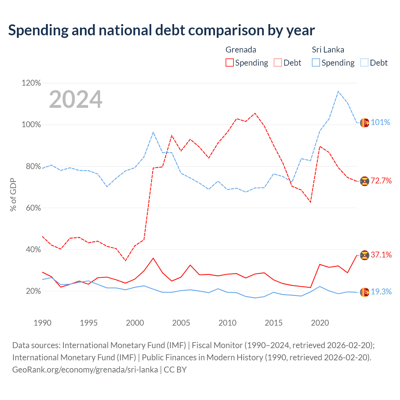 Grenada has $997M in government debt (72.7% of GDP), compared to $99.8B (100.8% of GDP) in Sri Lanka.