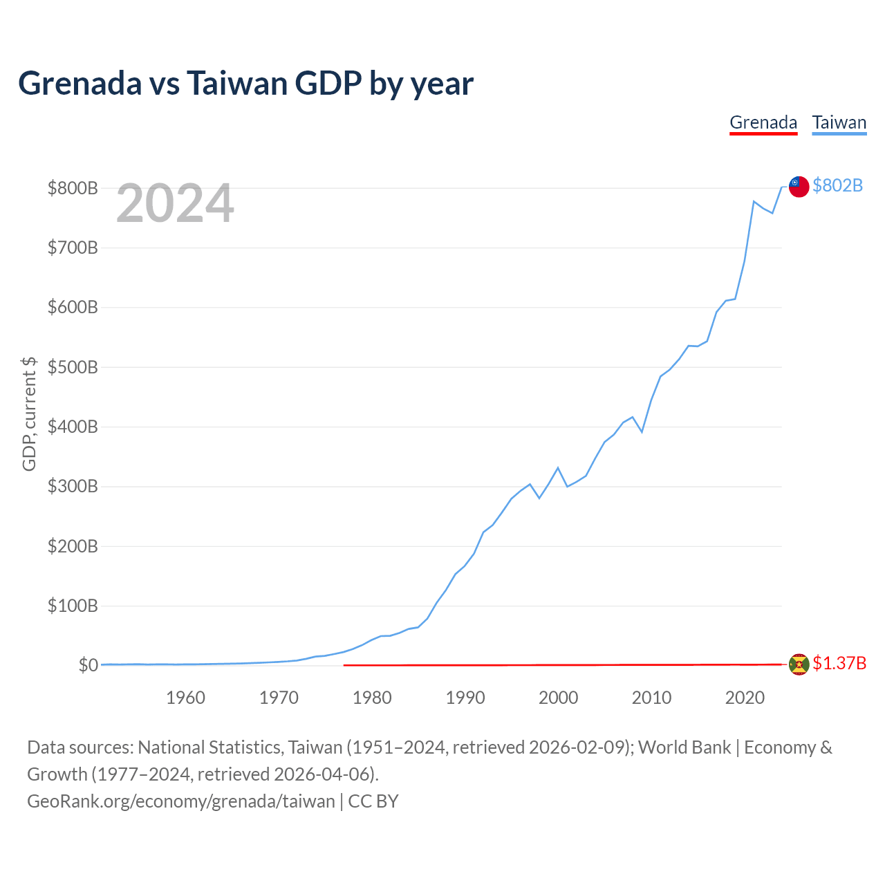 Grenada has a GDP of $1.37B compared to $802B for Taiwan, ranking 184/197 and 22/197 by economy size, respectively.
