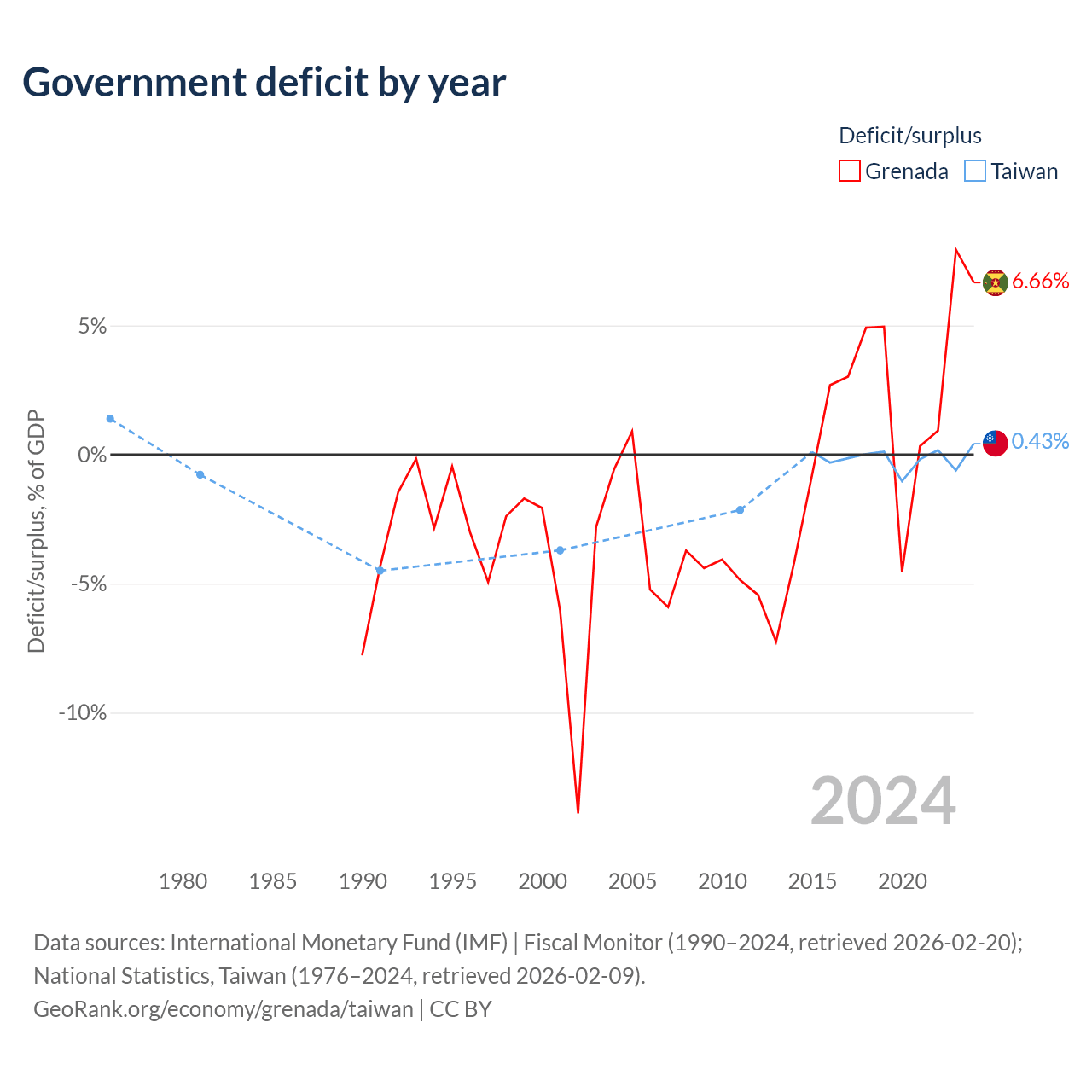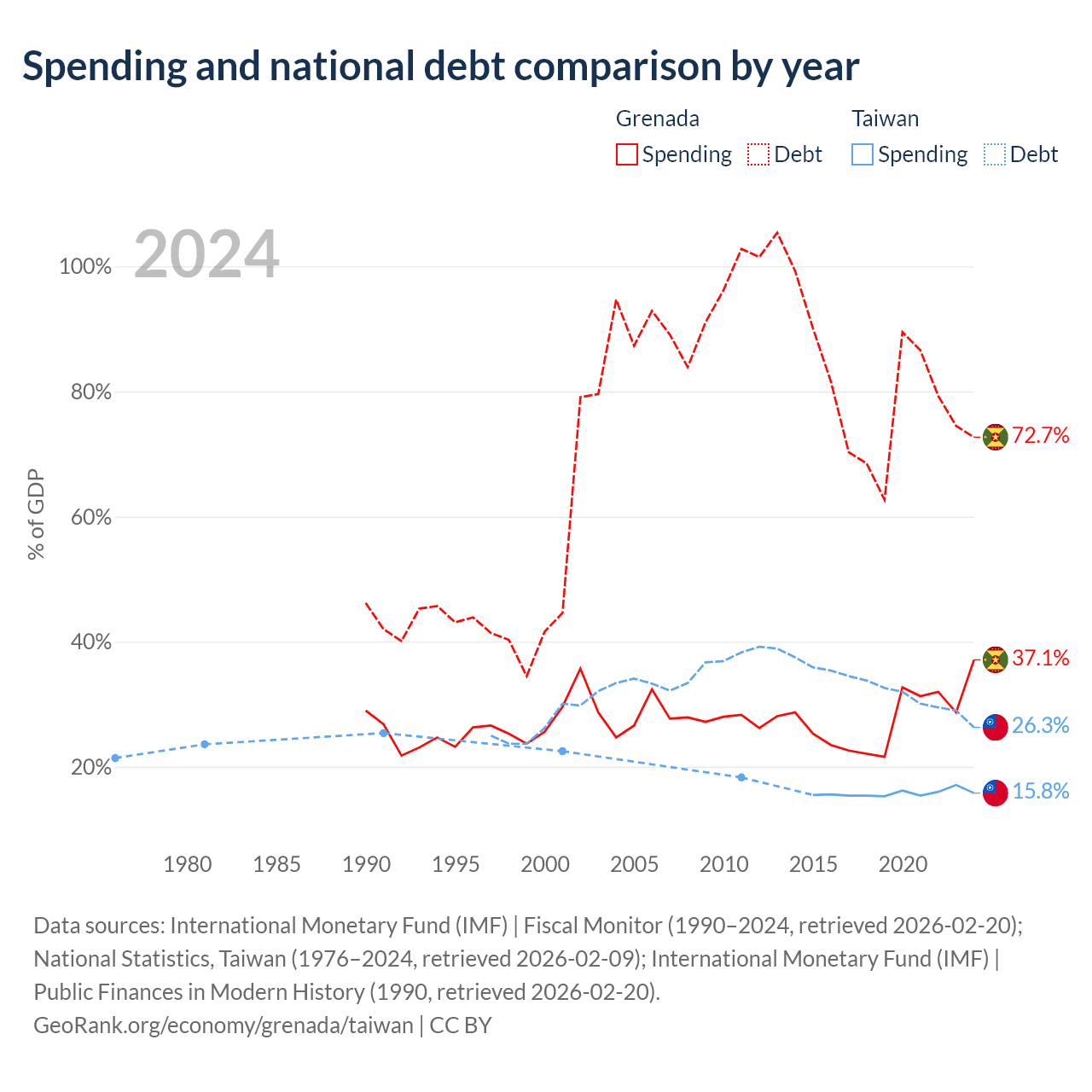 Grenada has $997M in government debt (72.7% of GDP), compared to $211B (26.3% of GDP) in Taiwan.