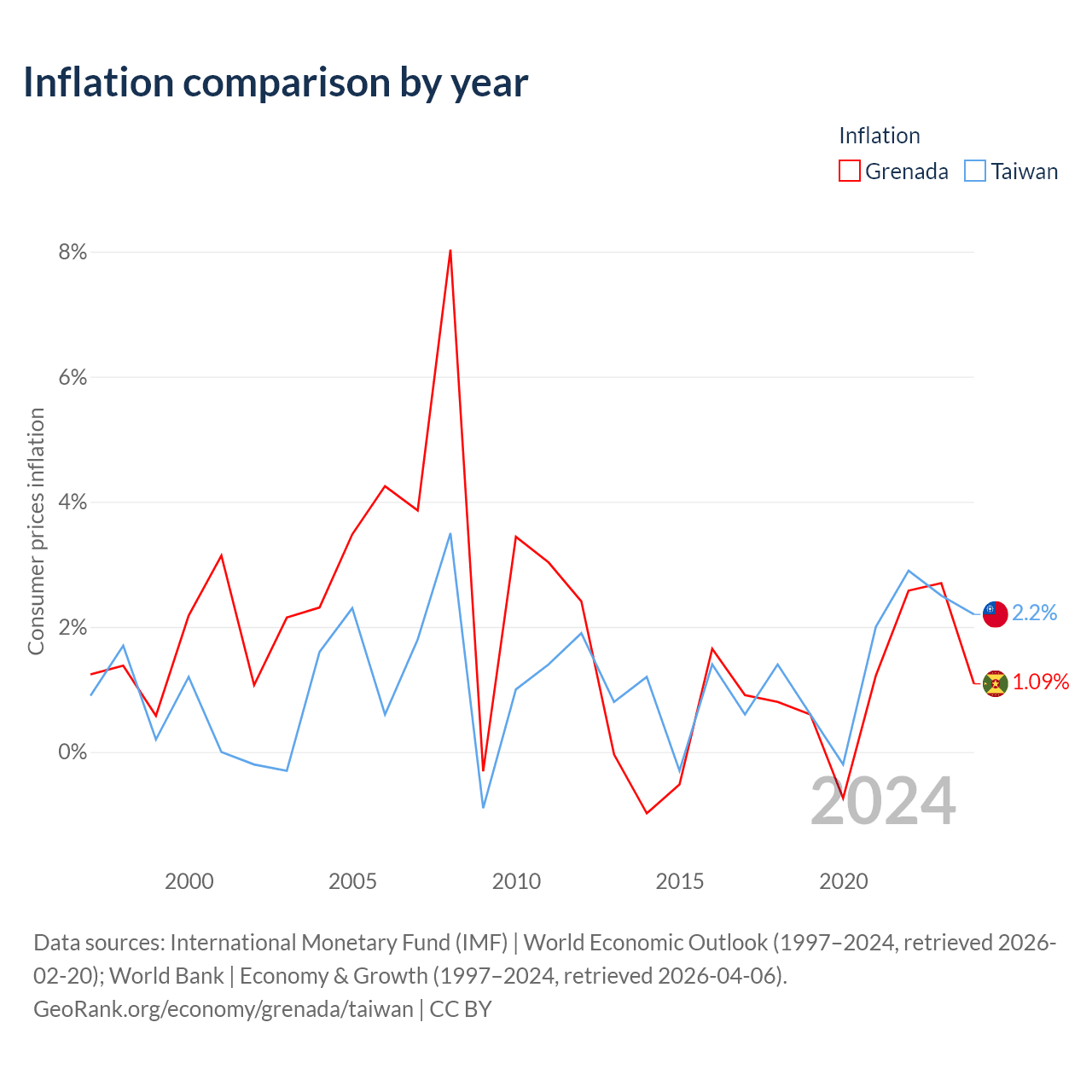 Over the past 28 years, Grenada has recorded an average annual inflation rate of 1.84%, compared with 1.14% in Taiwan. In 2024, inflation was 1.09% in Grenada and 2.2% in Taiwan.