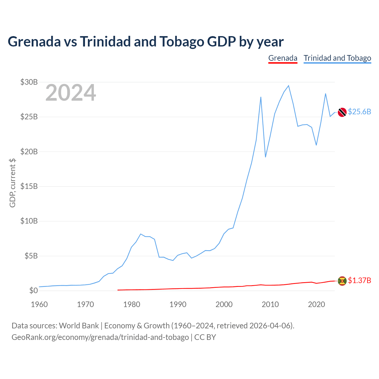 Grenada has a GDP of $1.37B compared to $25.6B for Trinidad and Tobago, ranking 184/197 and 115/197 by economy size, respectively.