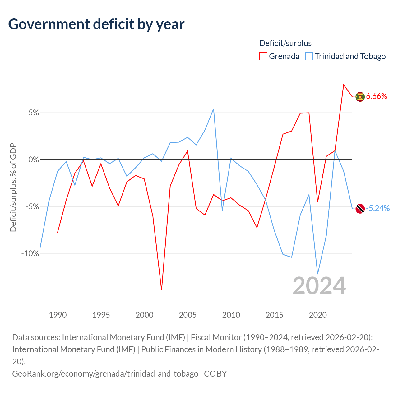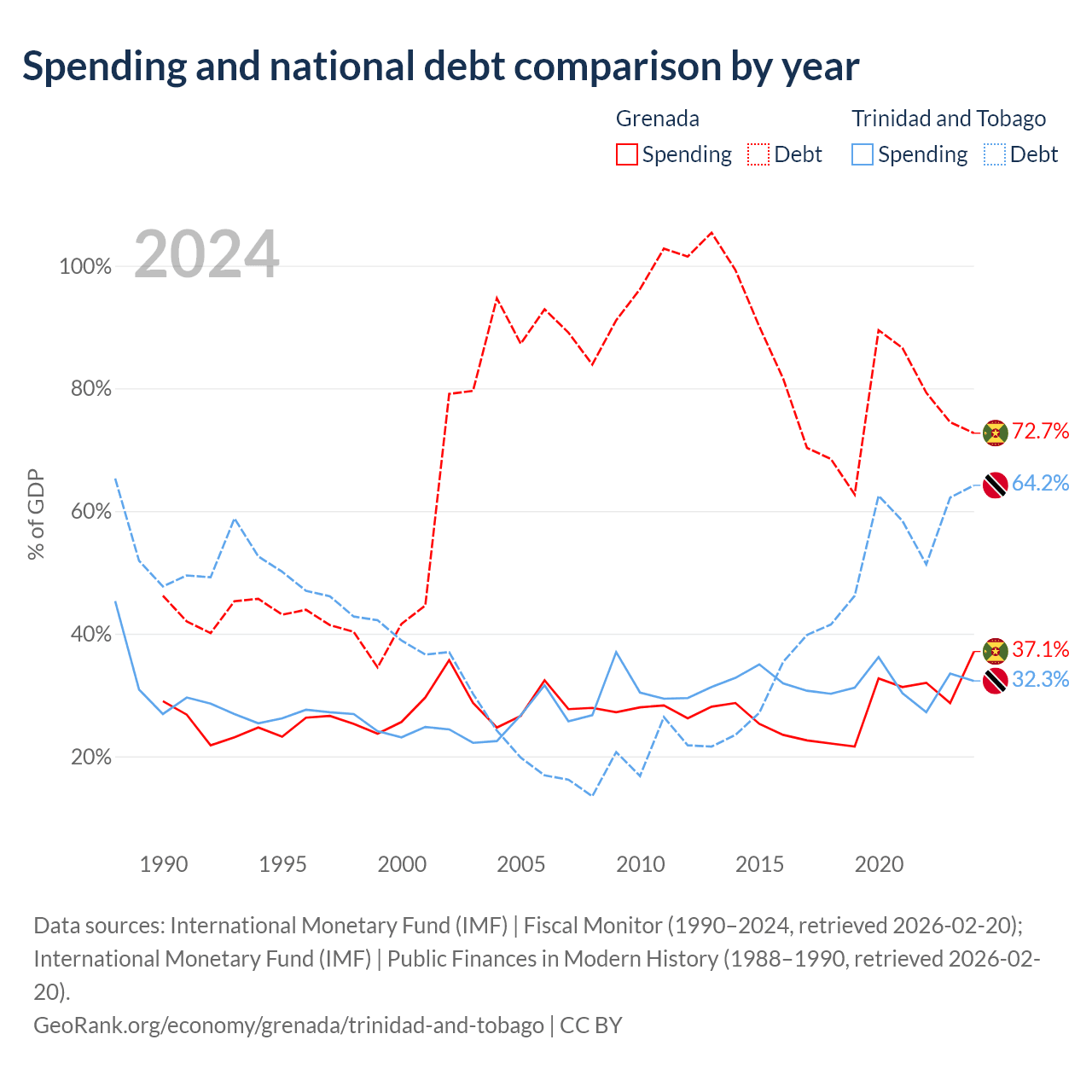 Grenada has $997M in government debt (72.7% of GDP), compared to $16.5B (64.2% of GDP) in Trinidad and Tobago.