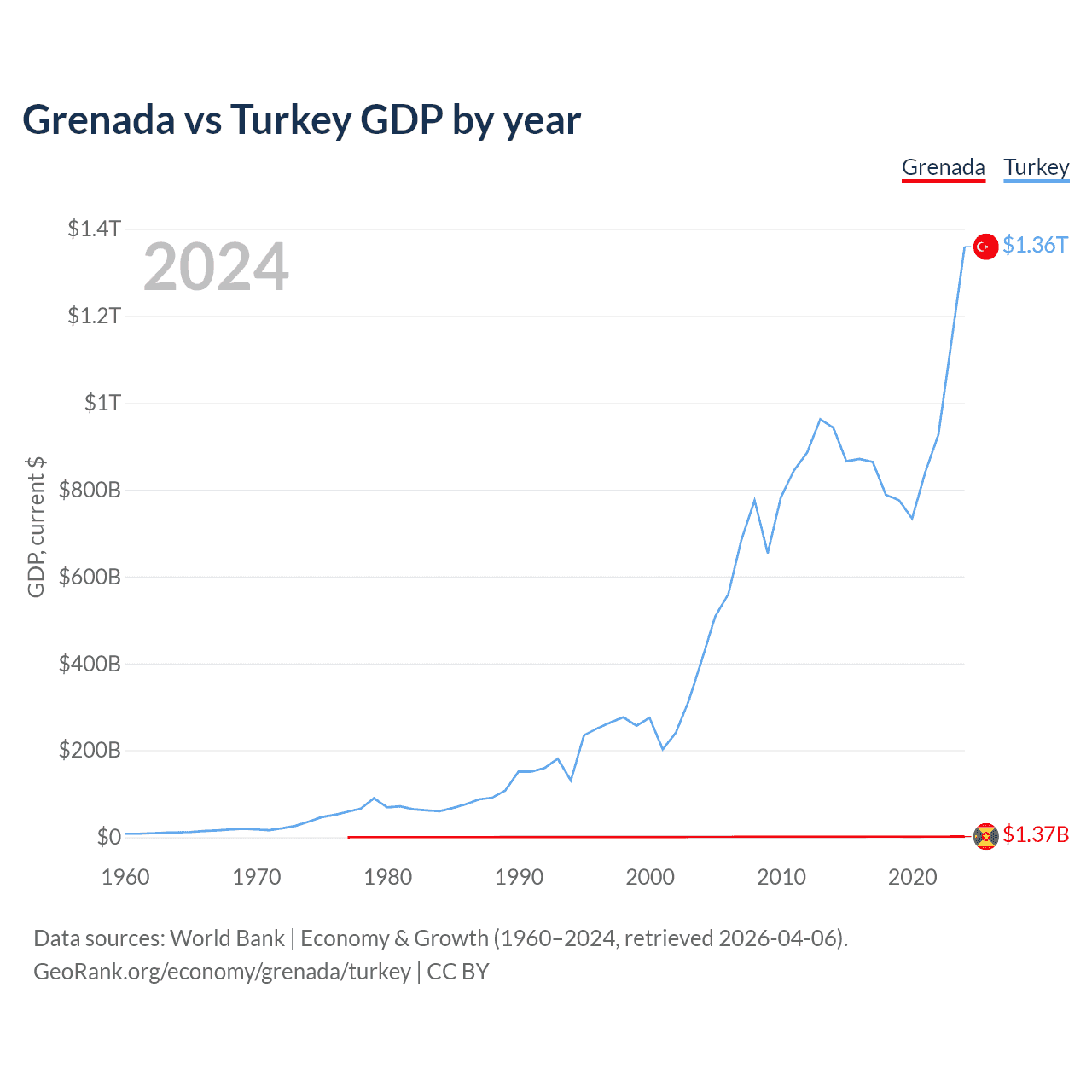 Grenada has a GDP of $1.37B compared to $1.36T for Turkey, ranking 184/197 and 17/197 by economy size, respectively.