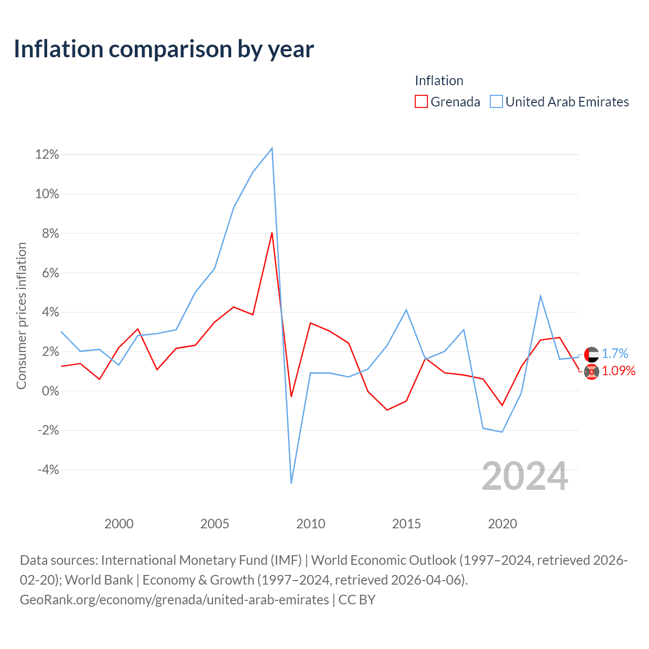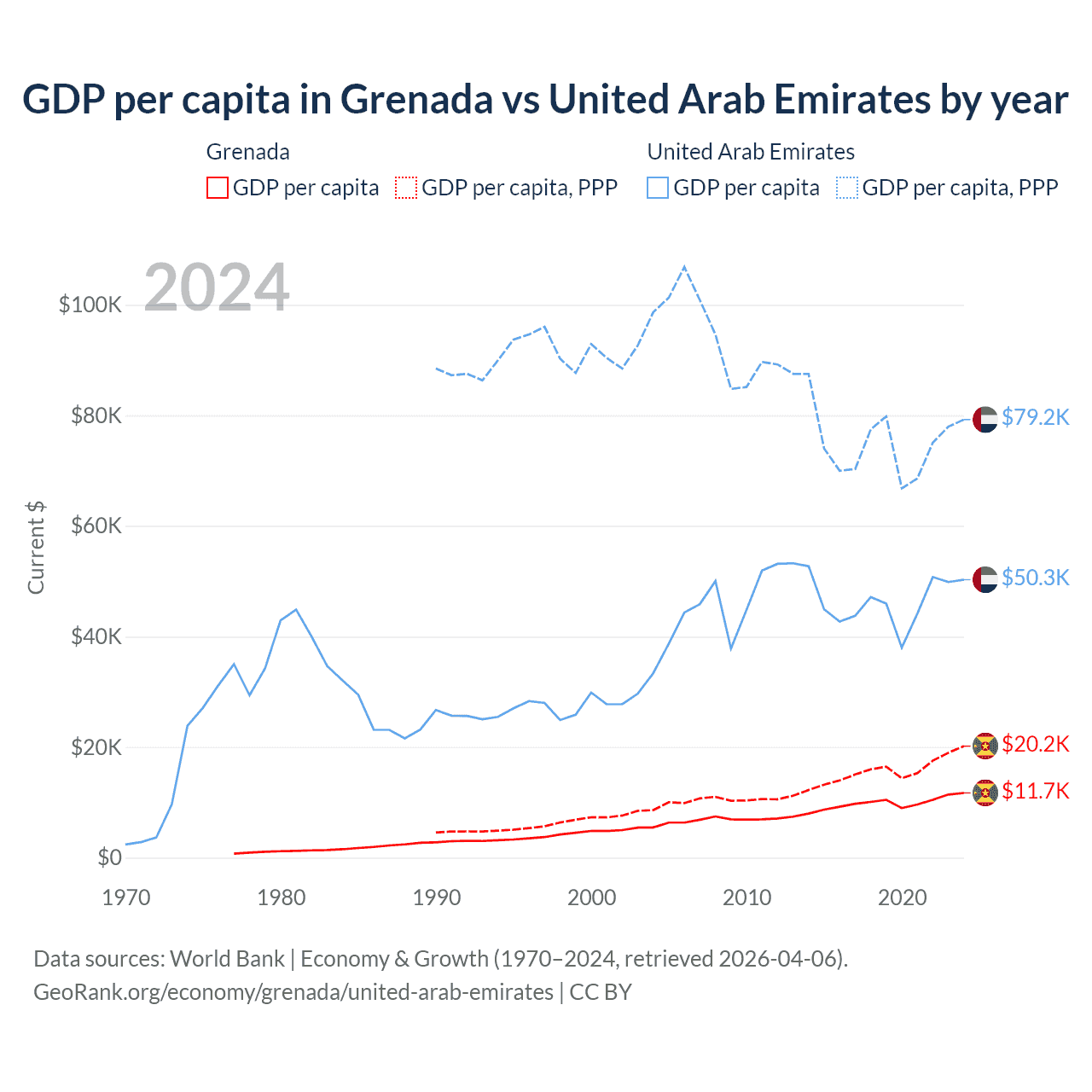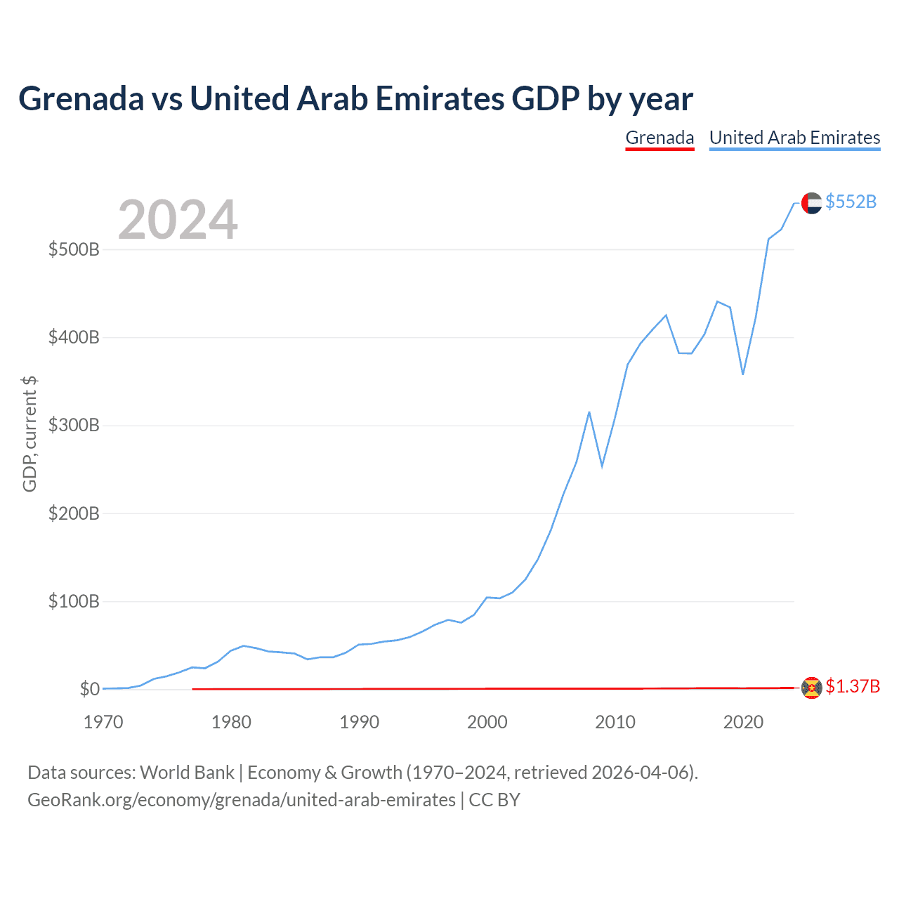 Grenada has a GDP of $1.37B compared to $552B for the United Arab Emirates, ranking 184/197 and 27/197 by economy size, respectively.