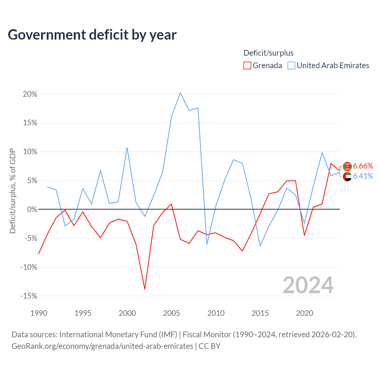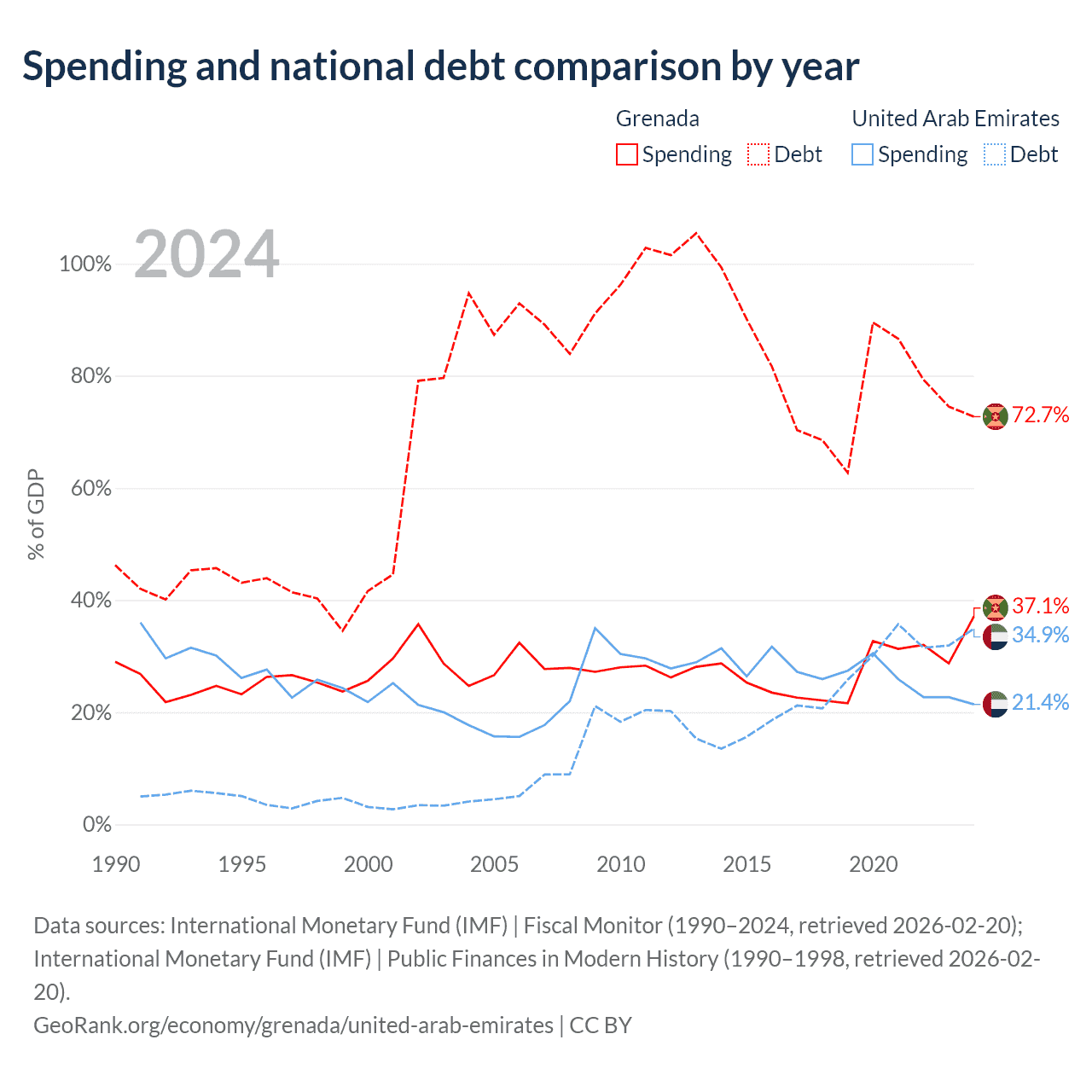 Grenada has $997M in government debt (72.7% of GDP), compared to $193B (34.9% of GDP) in the United Arab Emirates.