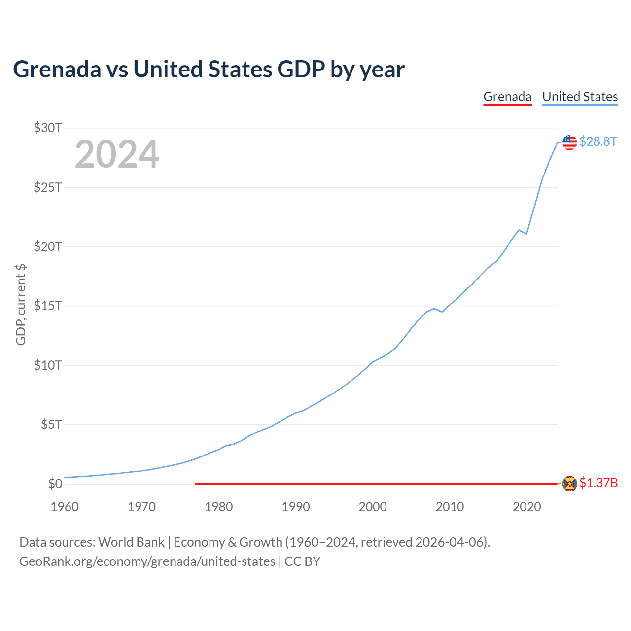 Grenada has a GDP of $1.37B compared to $28.8T for the United States, ranking 184/197 and 1/197 by economy size, respectively.