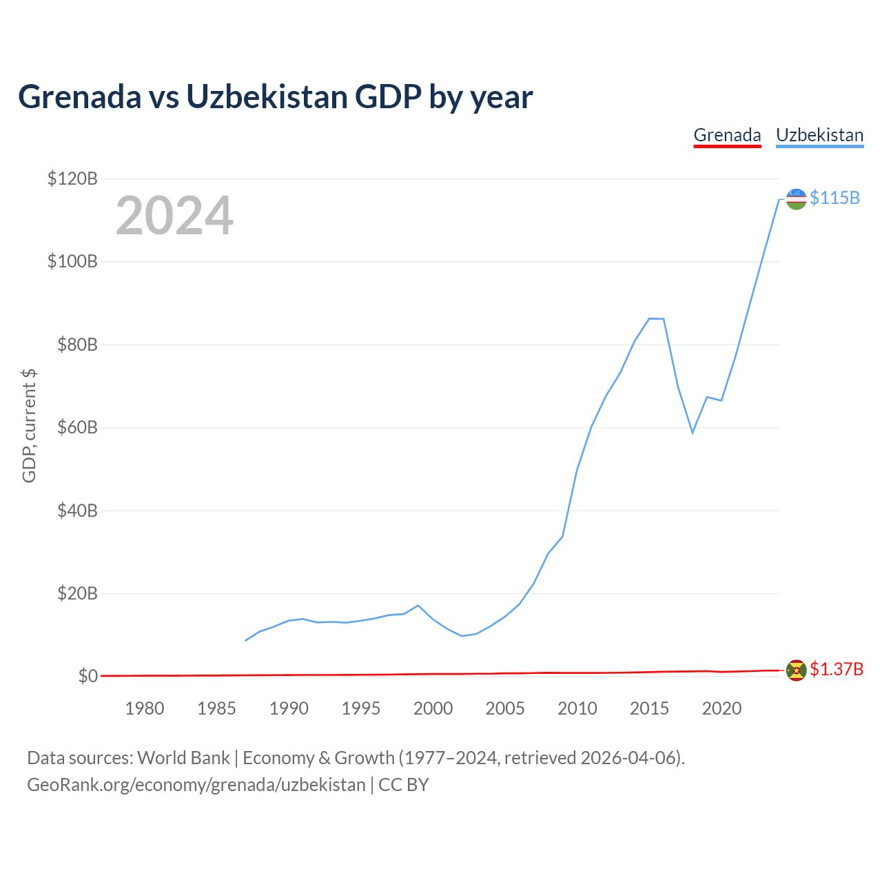 Grenada has a GDP of $1.37B compared to $115B for Uzbekistan, ranking 184/197 and 66/197 by economy size, respectively.