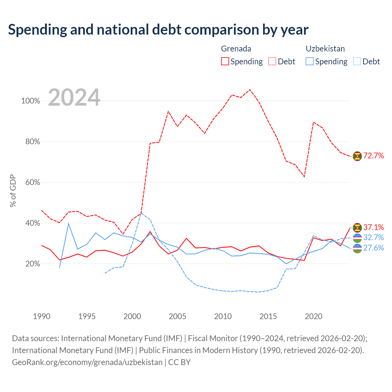 Grenada has $997M in government debt (72.7% of GDP), compared to $37.5B (32.7% of GDP) in Uzbekistan.