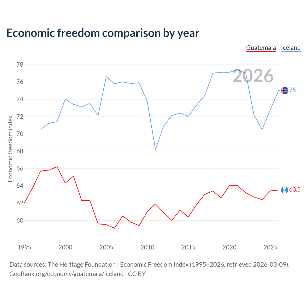 The Economic Freedom Index for Guatemala is 63.5, ranking 79/197, compared to 75 for Iceland, ranking 19/197. The chart above displays a comparison of annual changes in economic freedom indexes.