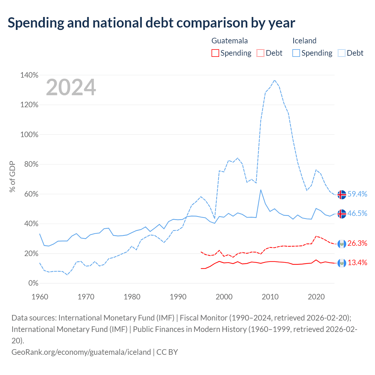 Guatemala has $29.8B in government debt (26.3% of GDP), compared to $19.8B (59.4% of GDP) in Iceland.