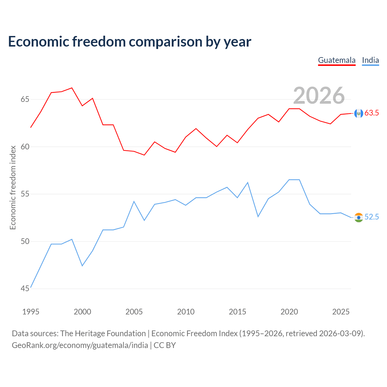 The Economic Freedom Index for Guatemala is 63.5, ranking 79/197, compared to 52.5 for India, ranking 146/197. The chart above displays a comparison of annual changes in economic freedom indexes.