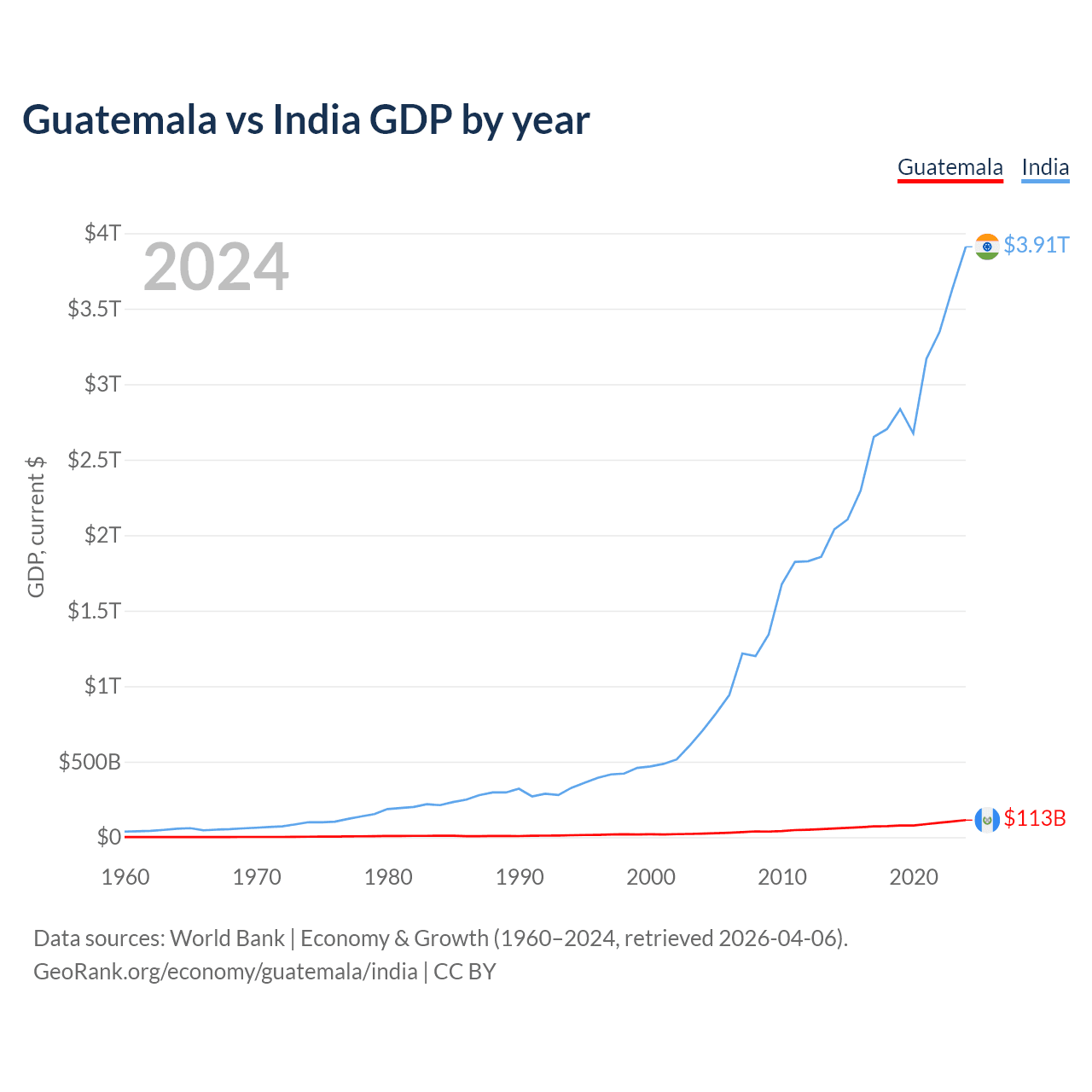 Guatemala has a GDP of $113B compared to $3.91T for India, ranking 68/197 and 5/197 by economy size, respectively.