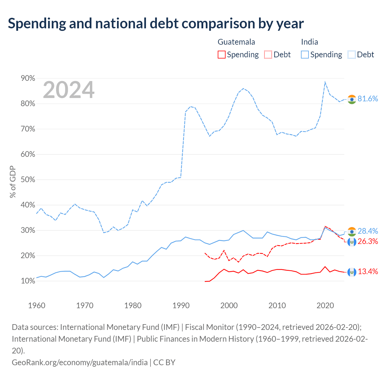 Guatemala has $29.8B in government debt (26.3% of GDP), compared to $3.19T (81.6% of GDP) in India.