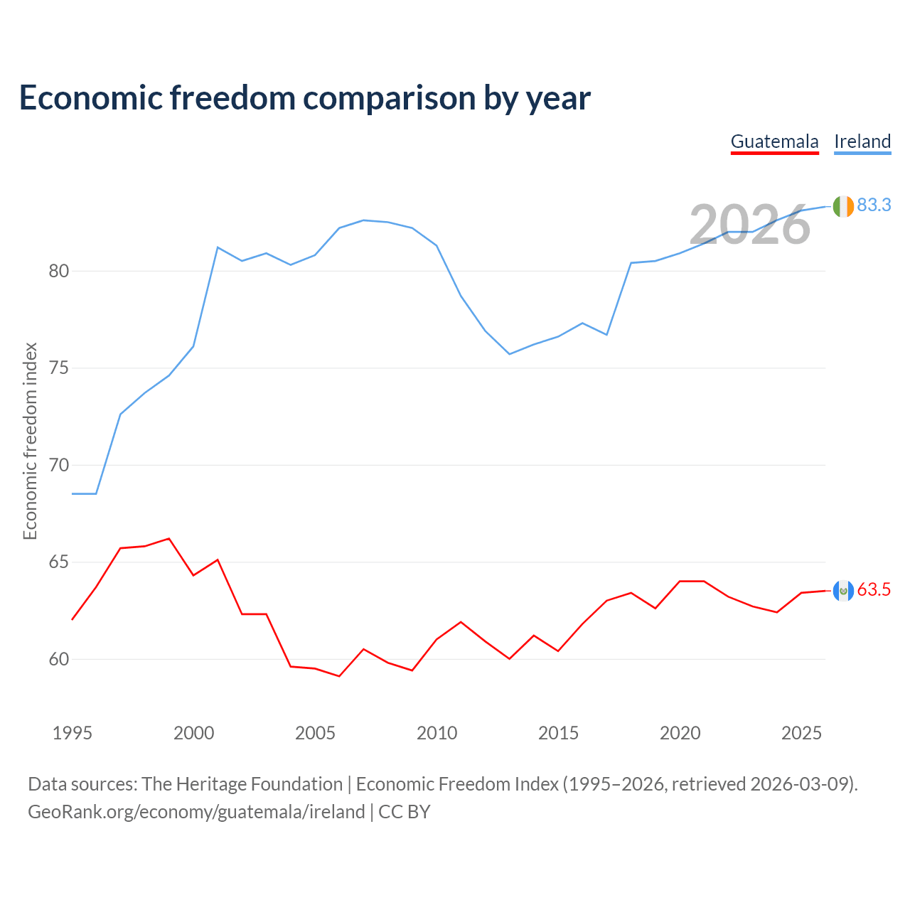 The Economic Freedom Index for Guatemala is 63.5, ranking 79/197, compared to 83.3 for Ireland, ranking 3/197. The chart above displays a comparison of annual changes in economic freedom indexes.