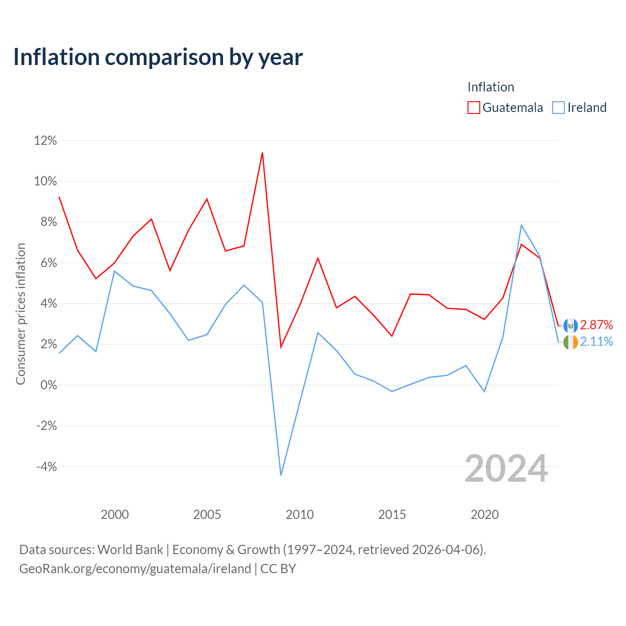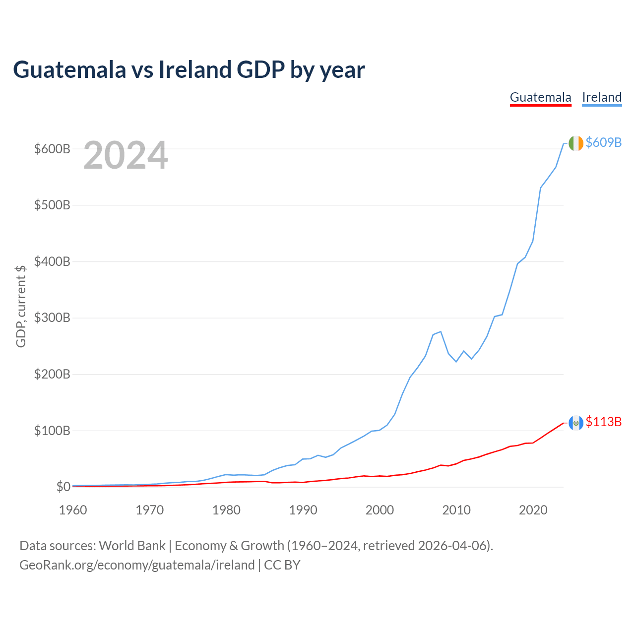 Guatemala has a GDP of $113B compared to $609B for Ireland, ranking 68/197 and 25/197 by economy size, respectively.