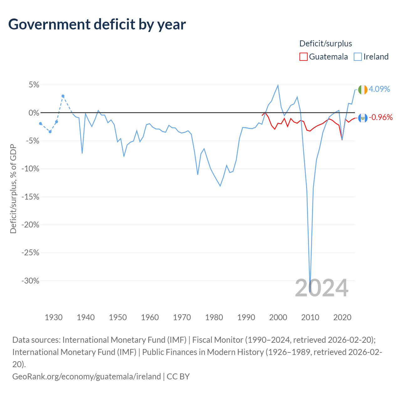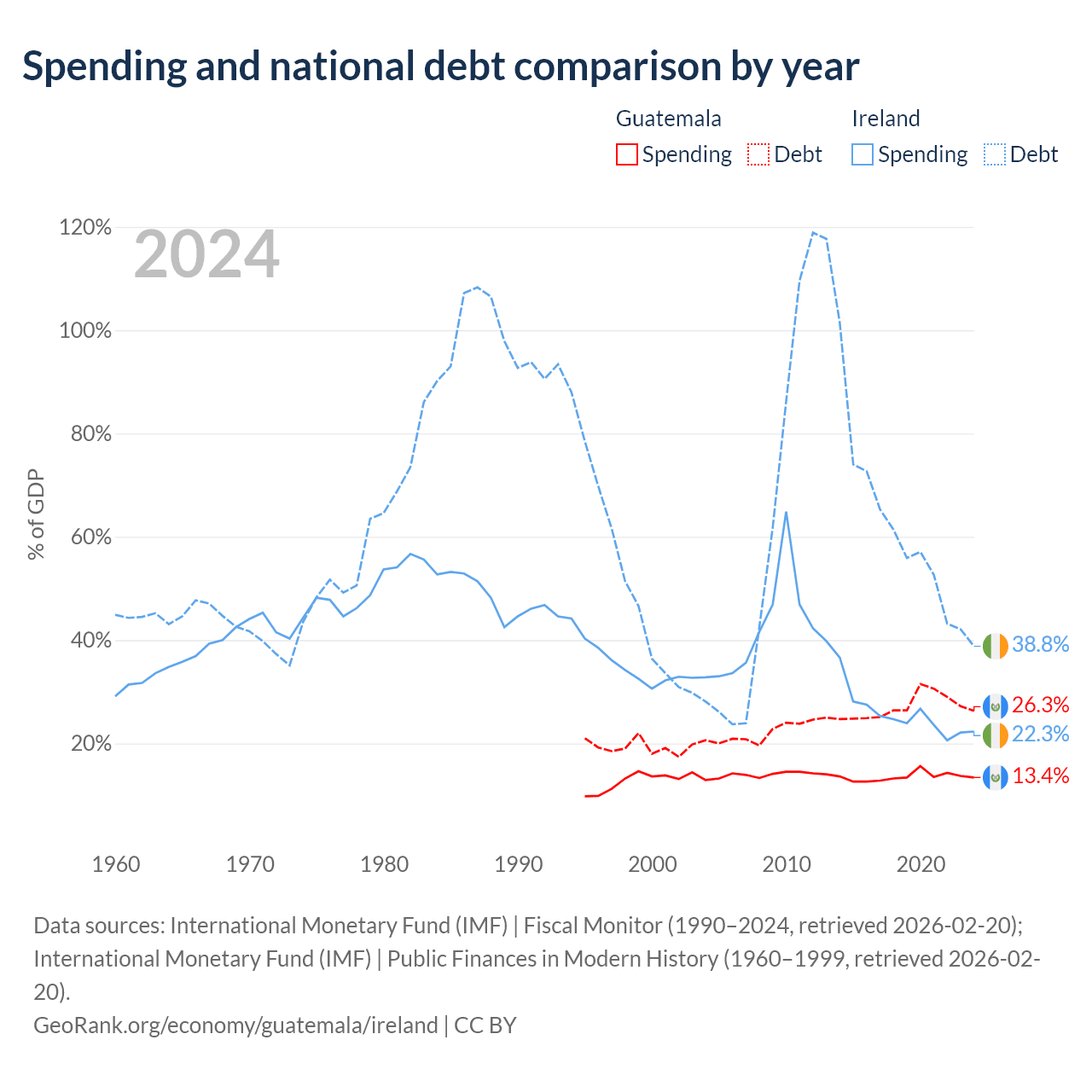 Guatemala has $29.8B in government debt (26.3% of GDP), compared to $236B (38.8% of GDP) in Ireland.