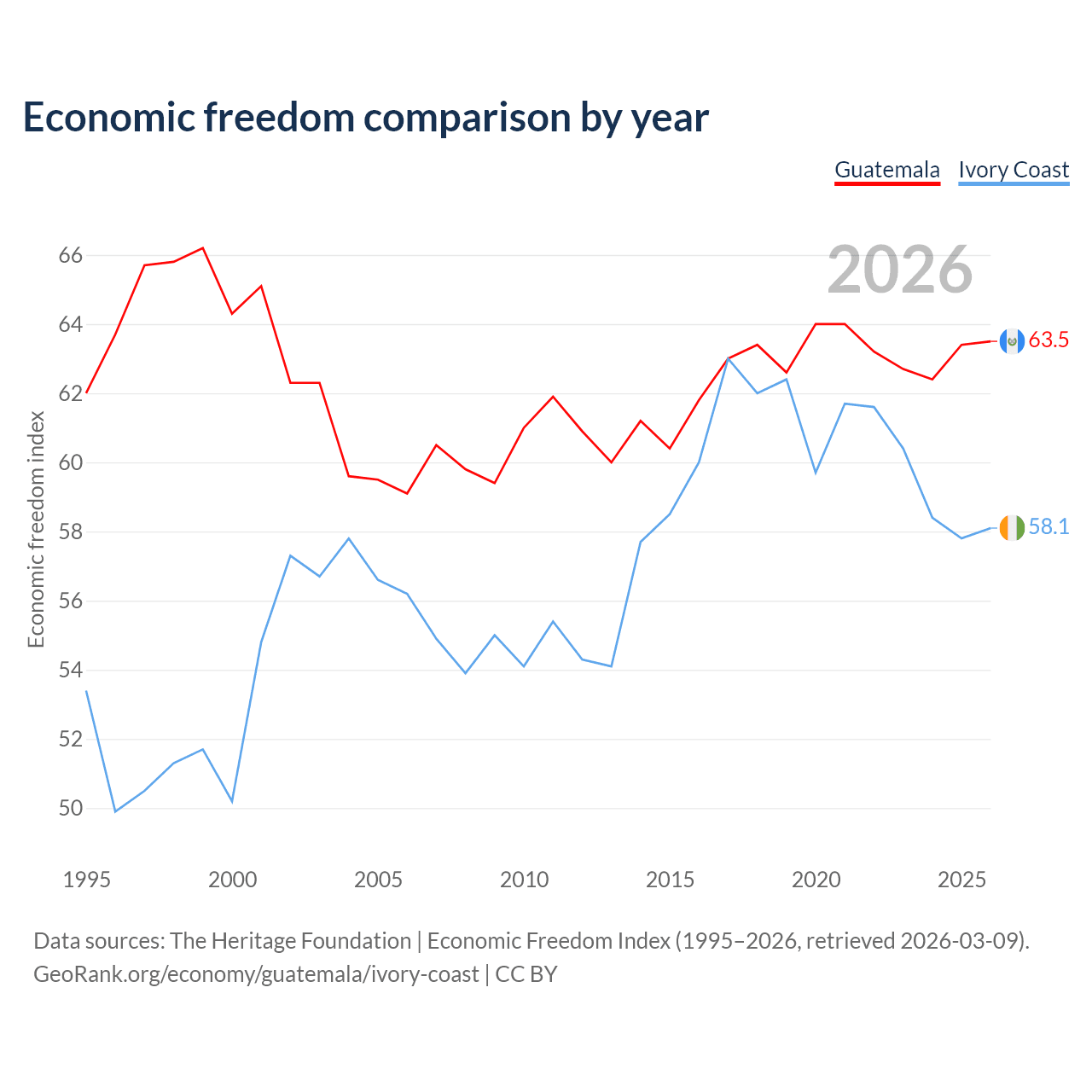 The Economic Freedom Index for Guatemala is 63.5, ranking 79/197, compared to 58.1 for Ivory Coast, ranking 111/197. The chart above displays a comparison of annual changes in economic freedom indexes.