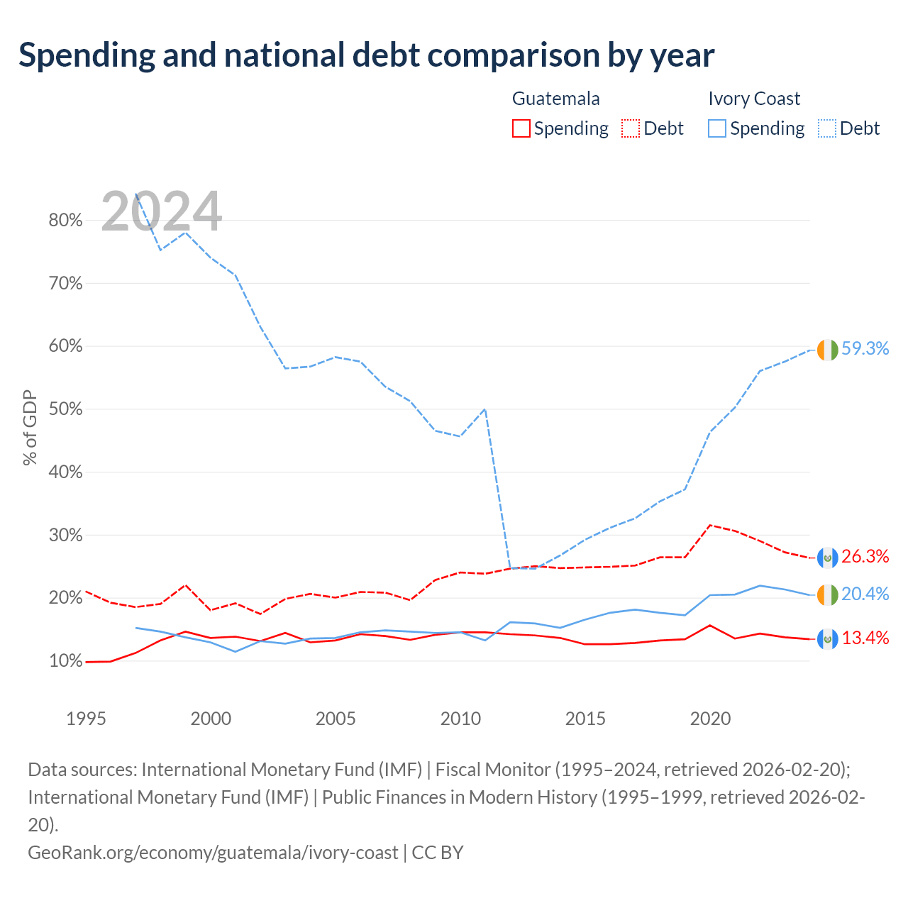 Guatemala has $29.8B in government debt (26.3% of GDP), compared to $51.6B (59.3% of GDP) in Ivory Coast.