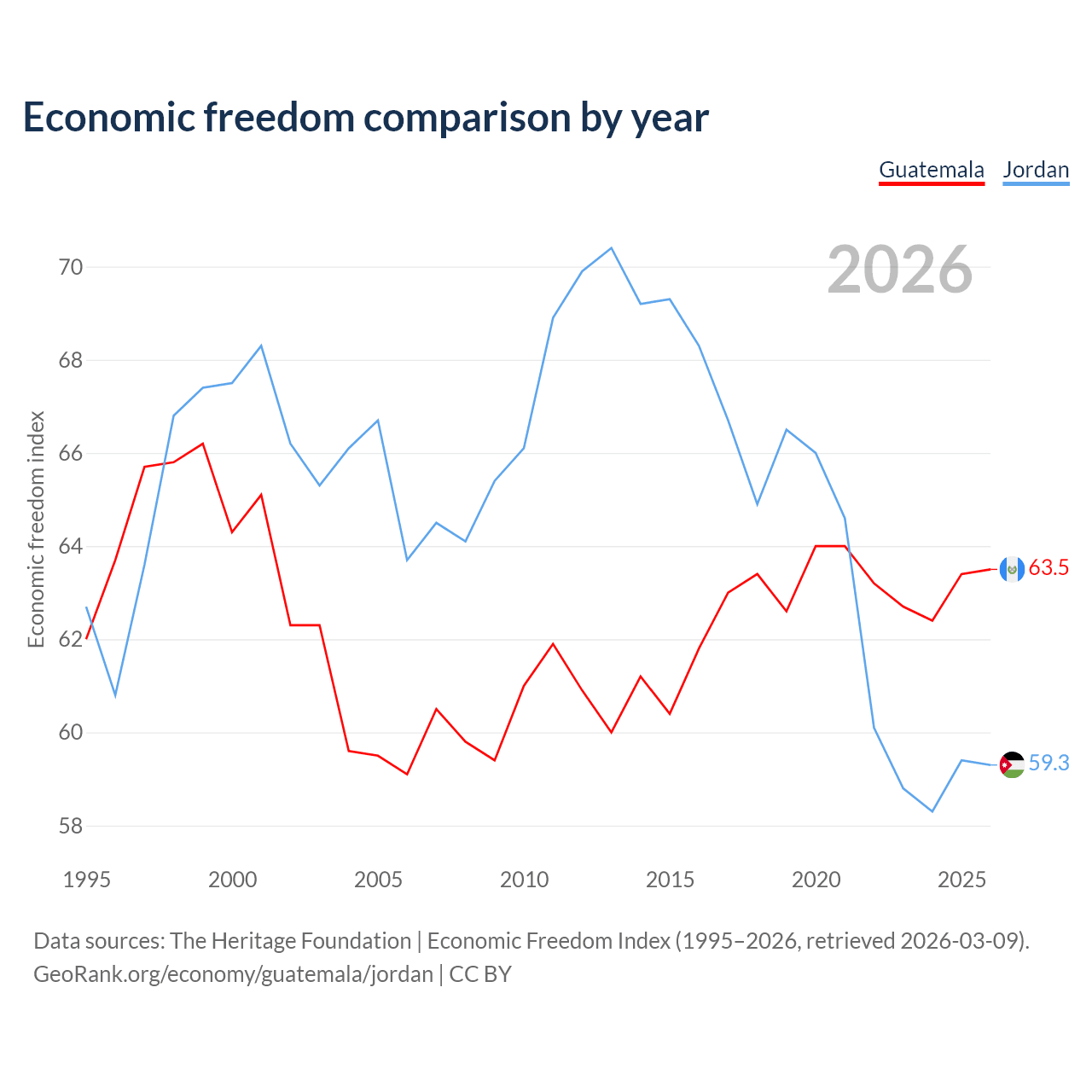 The Economic Freedom Index for Guatemala is 63.5, ranking 79/197, compared to 59.3 for Jordan, ranking 104/197. The chart above displays a comparison of annual changes in economic freedom indexes.