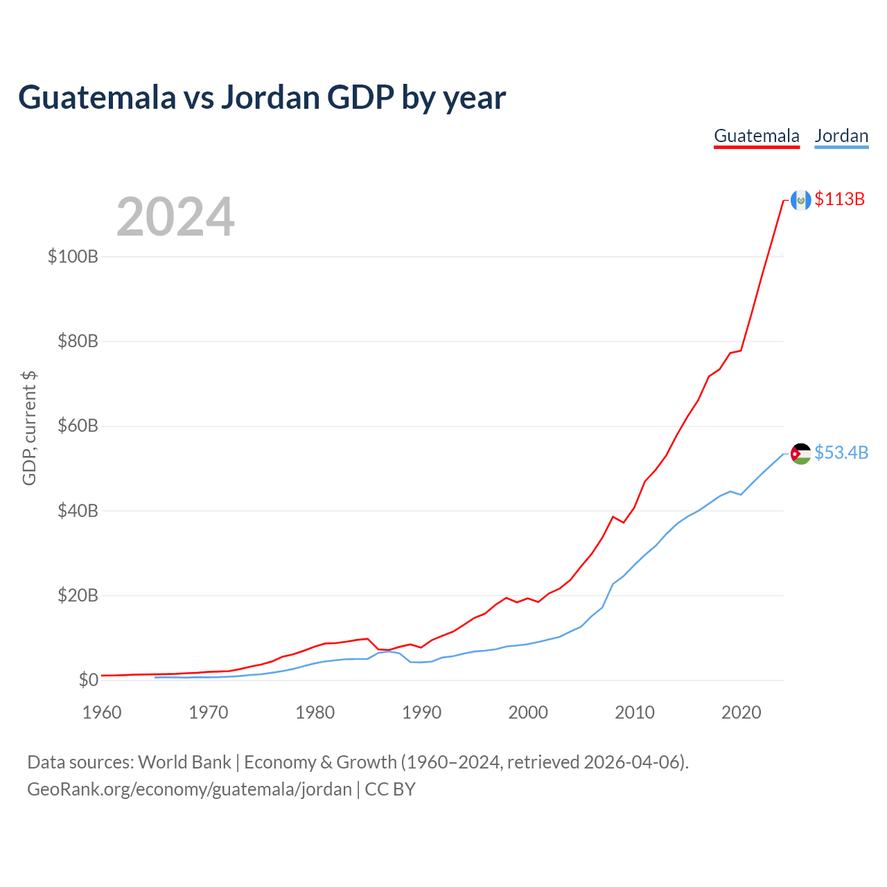Guatemala has a GDP of $113B compared to $53.4B for Jordan, ranking 68/197 and 90/197 by economy size, respectively.