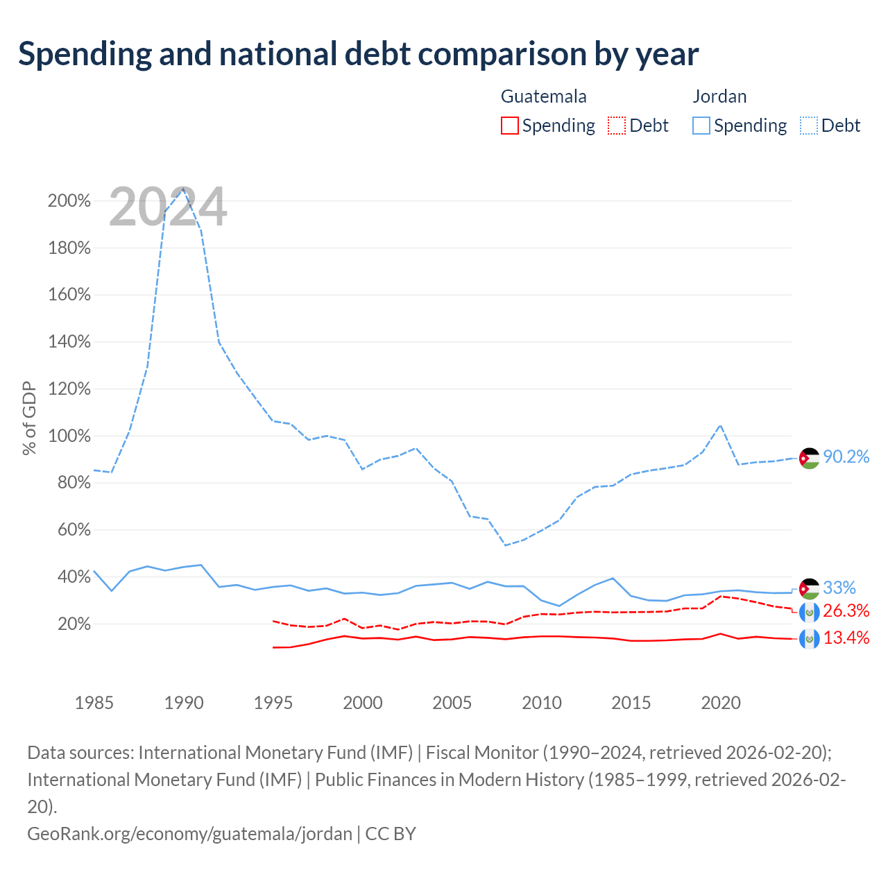 Guatemala has $29.8B in government debt (26.3% of GDP), compared to $48.1B (90.2% of GDP) in Jordan.