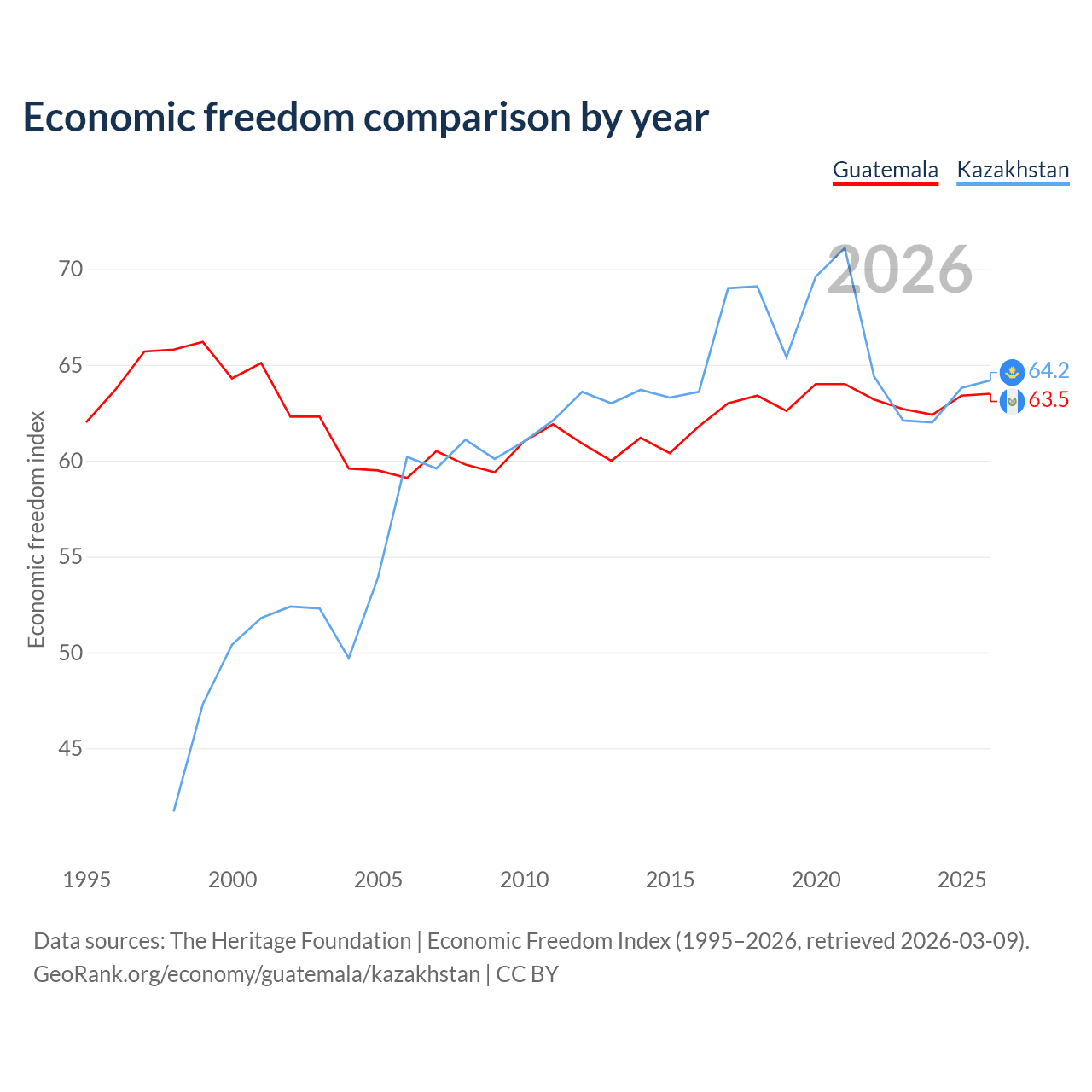 The Economic Freedom Index for Guatemala is 63.5, ranking 79/197, compared to 64.2 for Kazakhstan, ranking 75/197. The chart above displays a comparison of annual changes in economic freedom indexes.