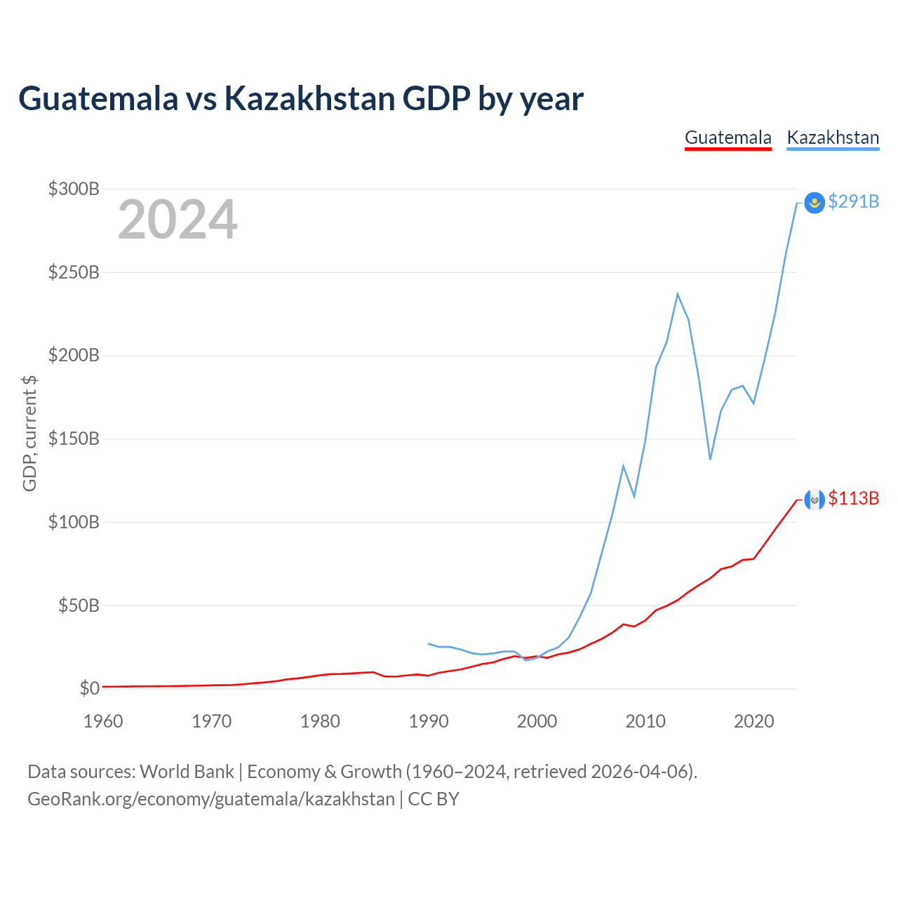 Guatemala has a GDP of $113B compared to $291B for Kazakhstan, ranking 68/197 and 48/197 by economy size, respectively.