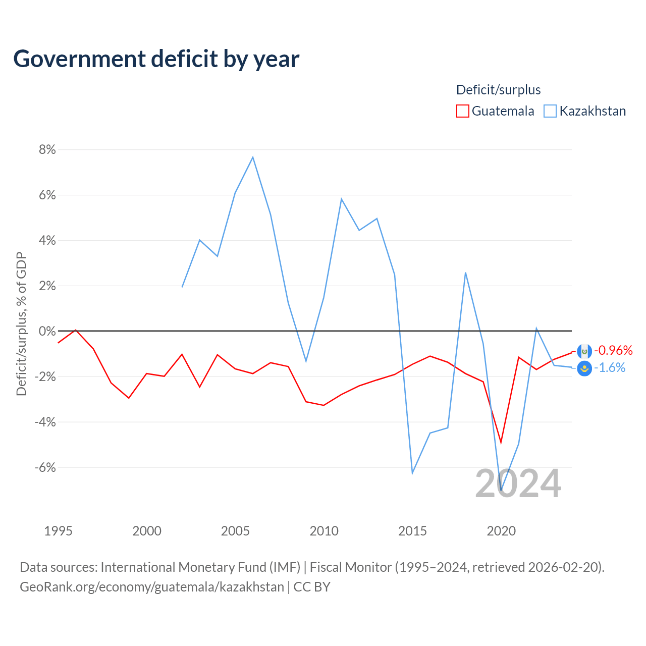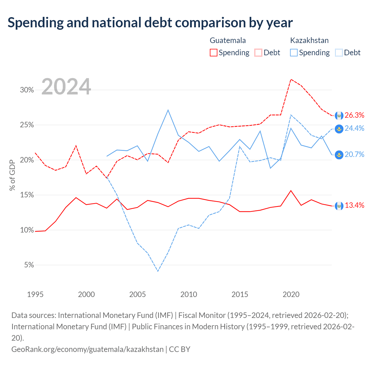 Guatemala has $29.8B in government debt (26.3% of GDP), compared to $71.1B (24.4% of GDP) in Kazakhstan.
