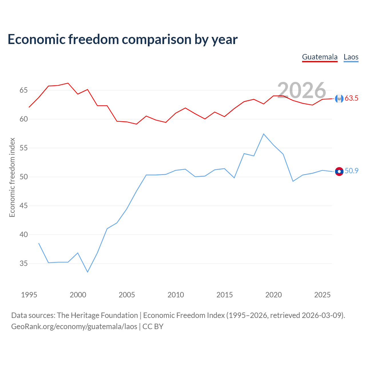 The Economic Freedom Index for Guatemala is 63.5, ranking 79/197, compared to 50.9 for Laos, ranking 157/197. The chart above displays a comparison of annual changes in economic freedom indexes.