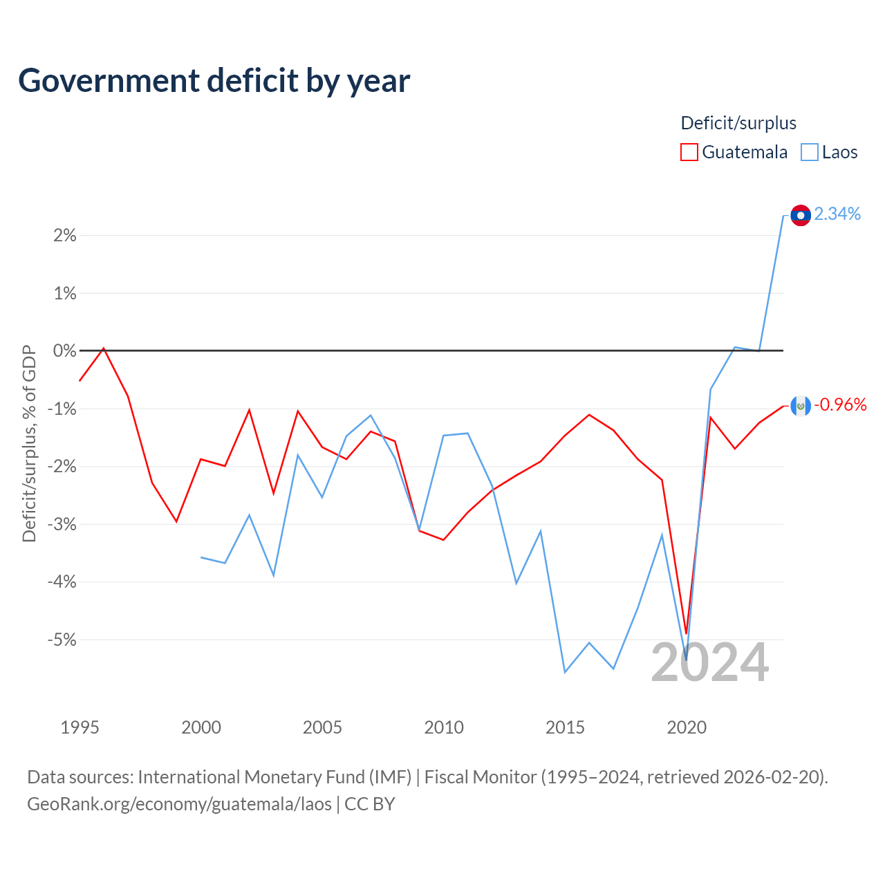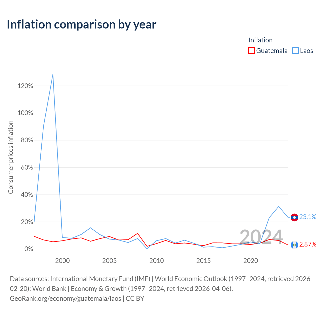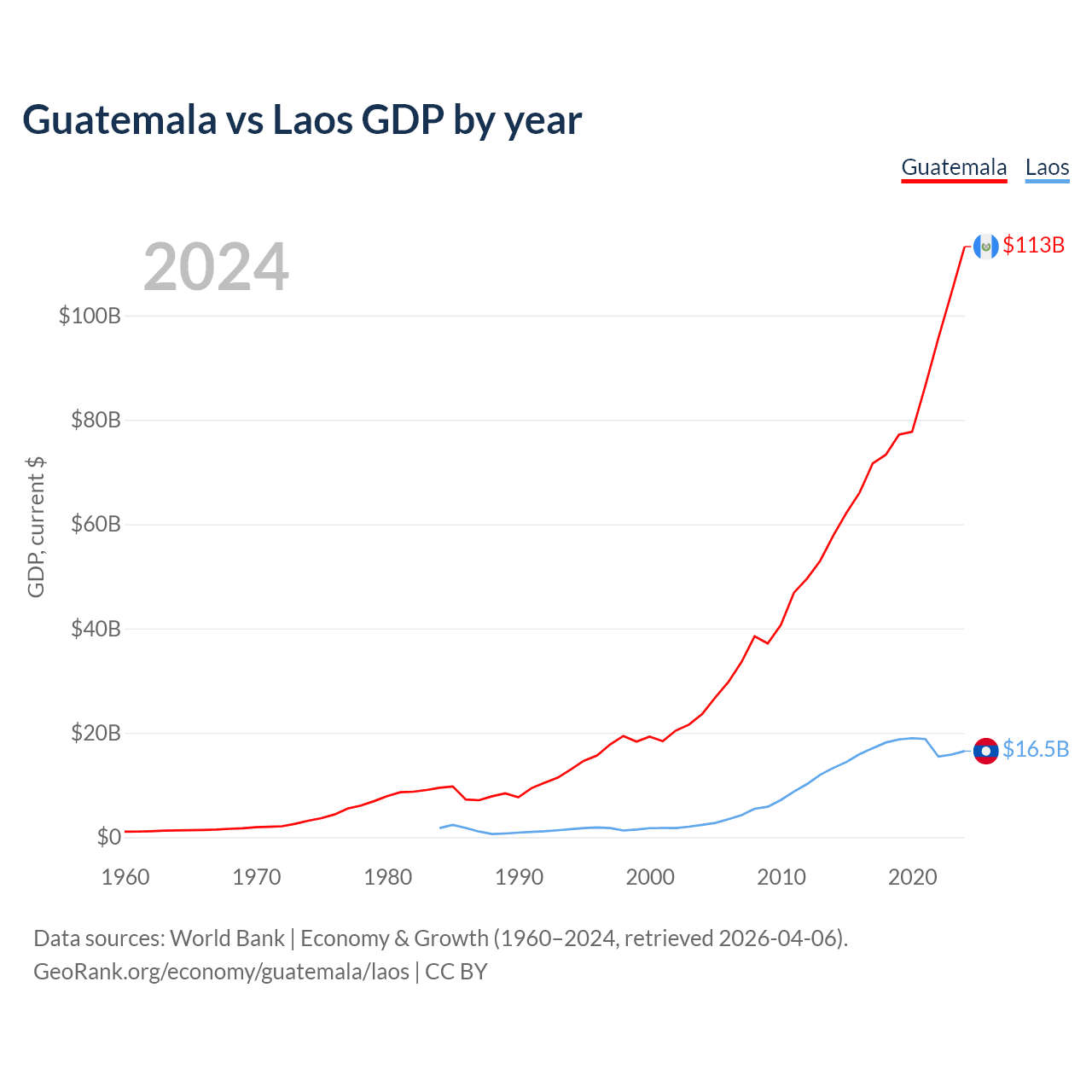 Guatemala has a GDP of $113B compared to $16.5B for Laos, ranking 68/197 and 139/197 by economy size, respectively.