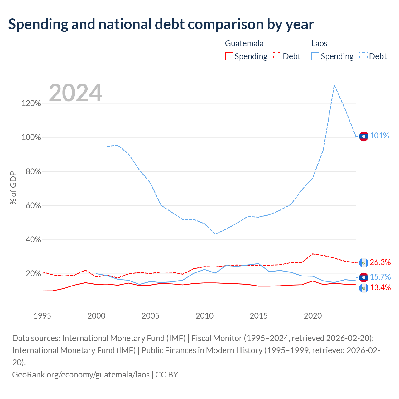 Guatemala has $29.8B in government debt (26.3% of GDP), compared to $16.6B (100.5% of GDP) in Laos.