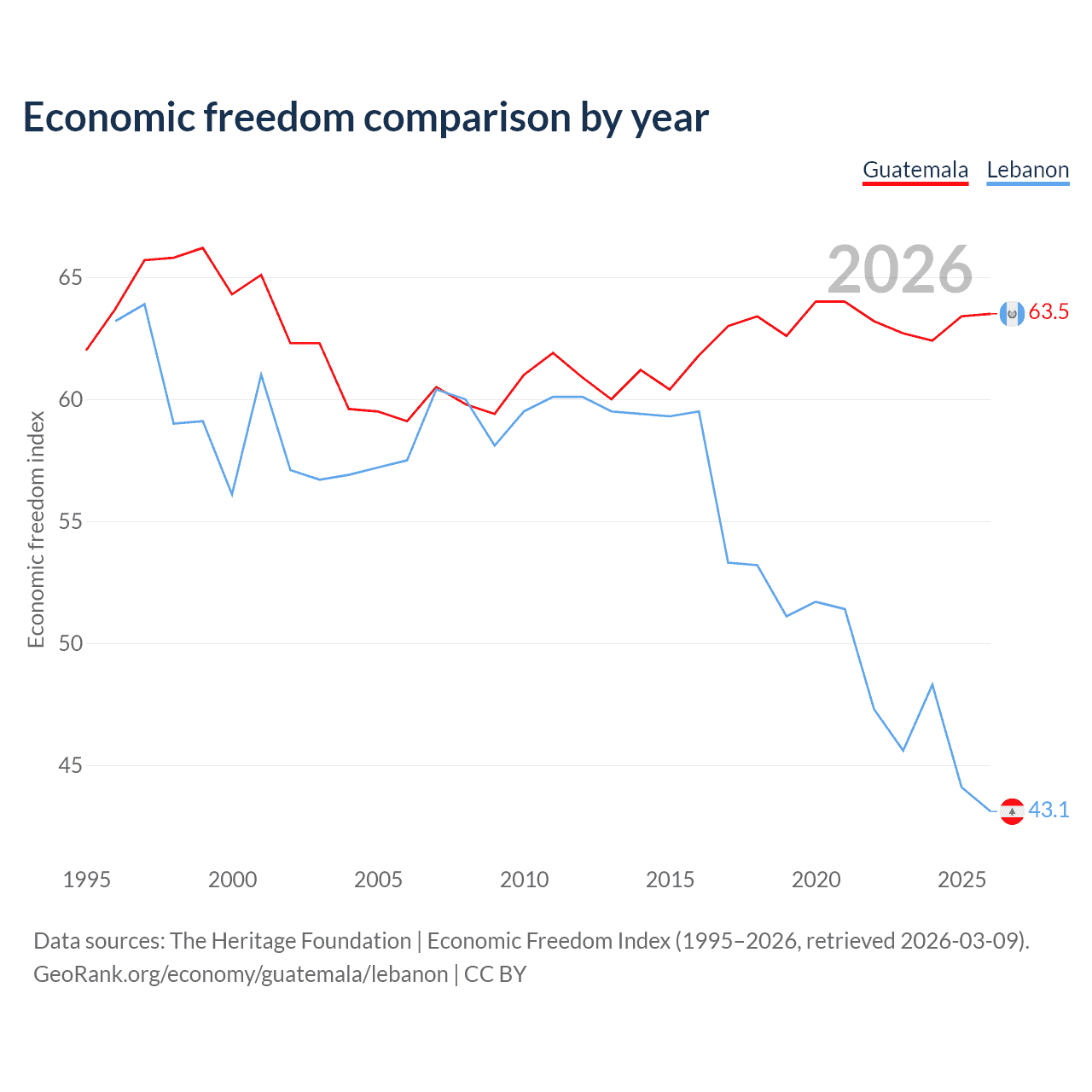 The Economic Freedom Index for Guatemala is 63.5, ranking 79/197, compared to 43.1 for Lebanon, ranking 183/197. The chart above displays a comparison of annual changes in economic freedom indexes.